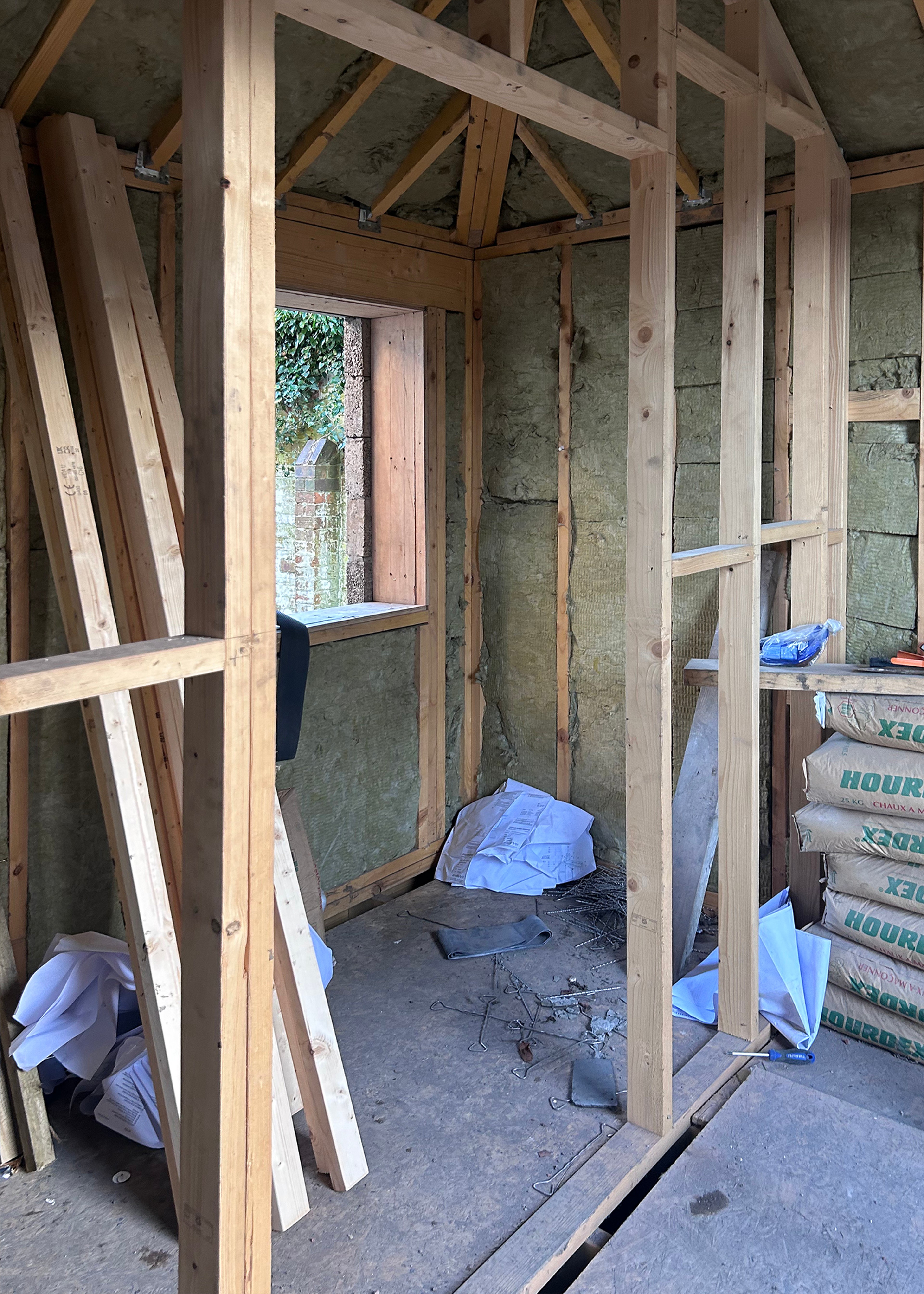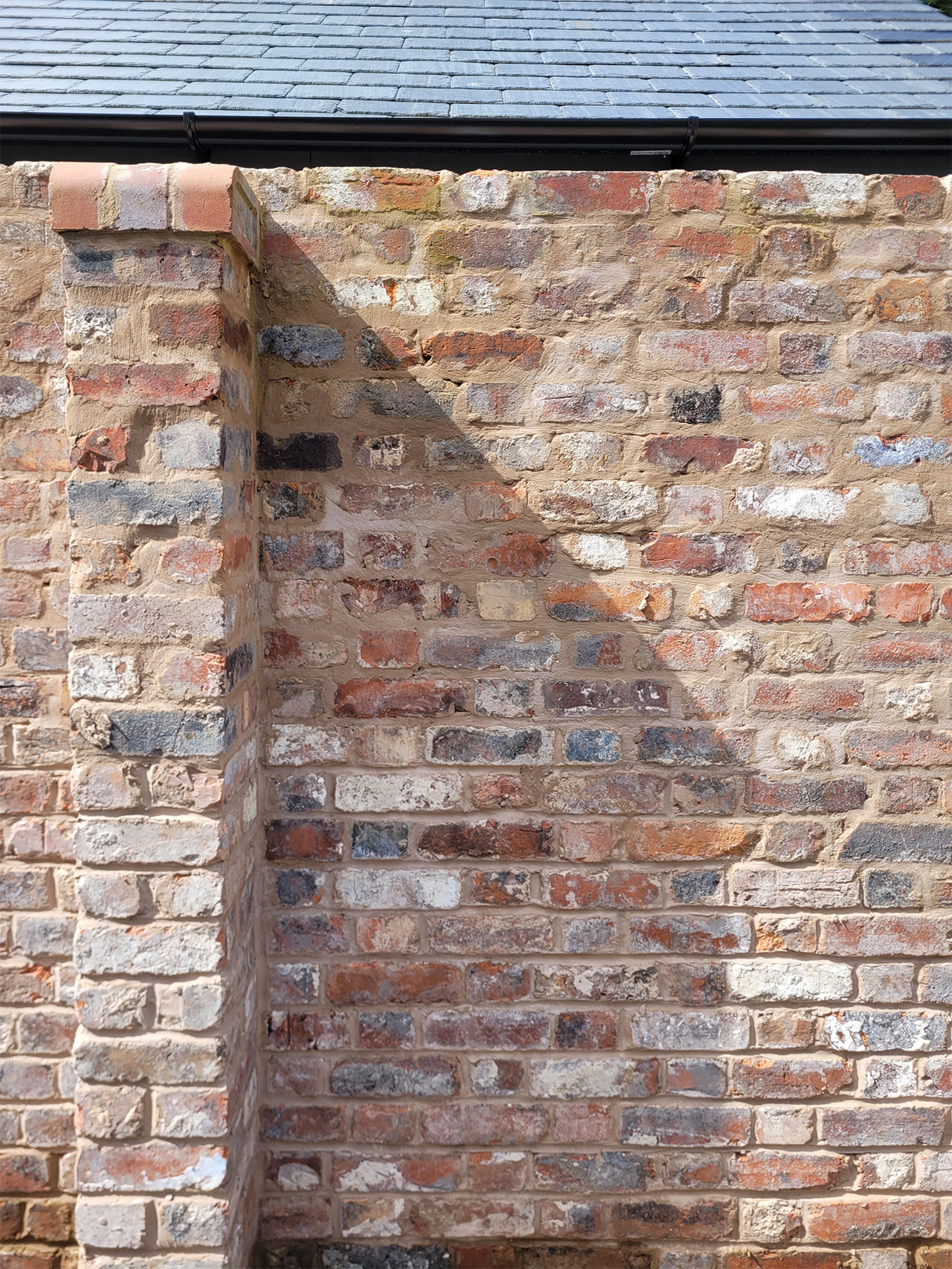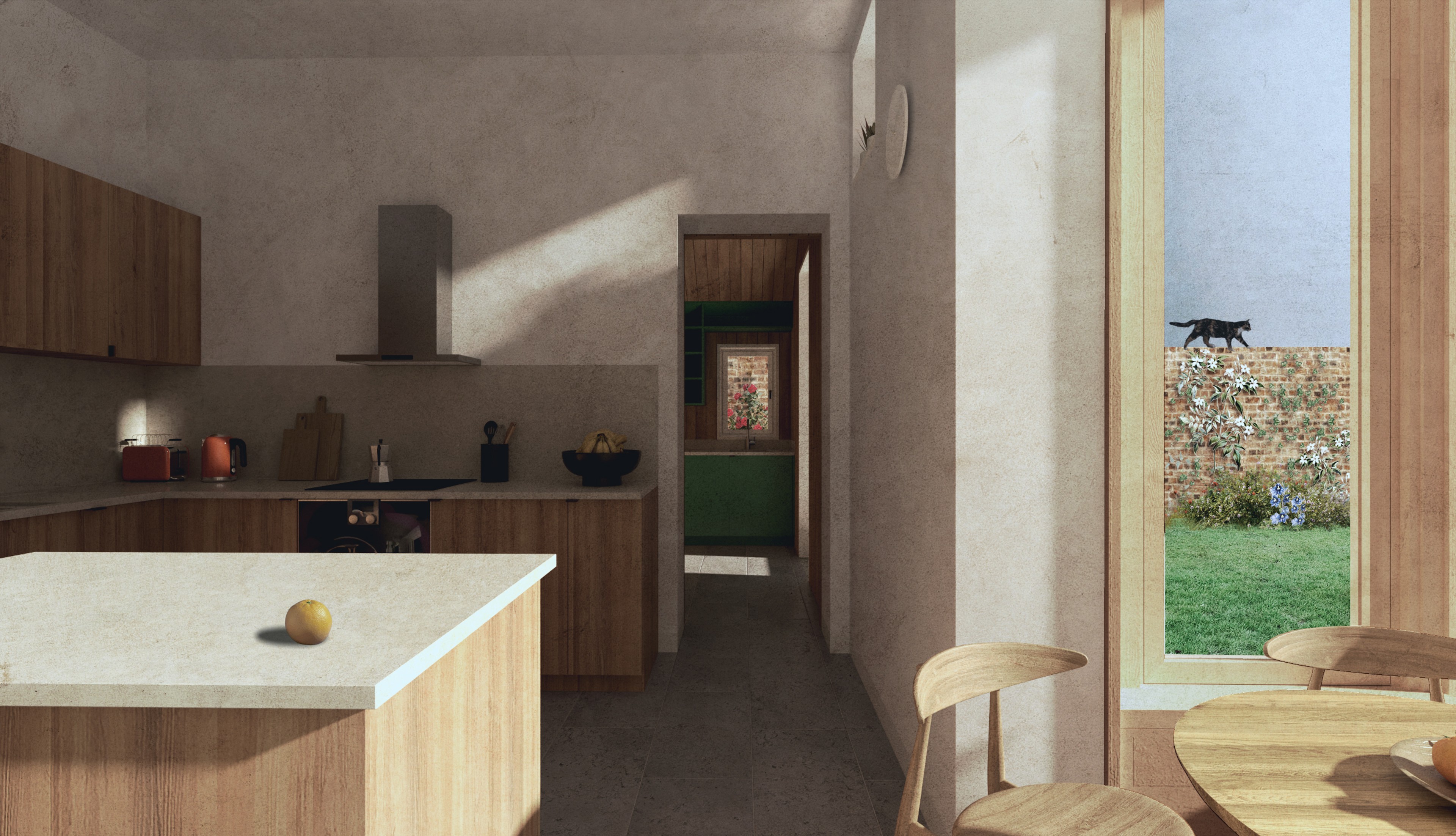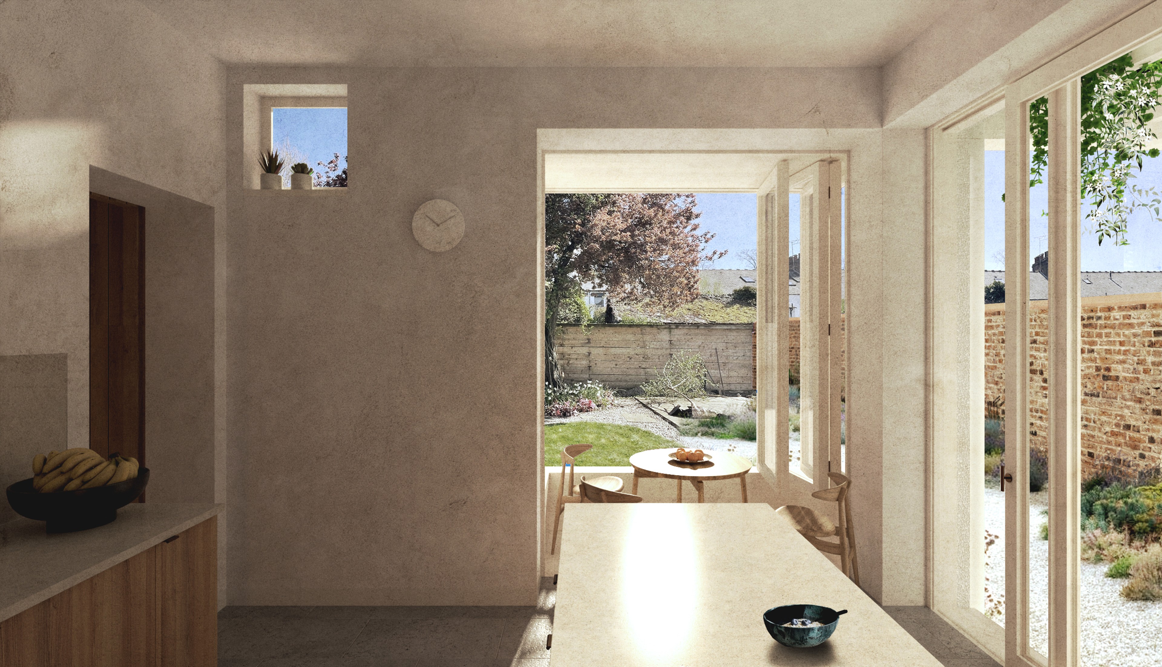 A small pergola is attached to the dining room and is accessed through new tall, glazed doors. Climbing plants will provide dappled light and shade over-head. These elements form a new composition holding the north edge of the garden, comprising smooth and rough lime renders, timber, stone and brick, all whitened to accentuate their differing textures. The project is centred around the experience of being in the new enlarged kitchen, now fully lined in natural materials, generously lit from the south, connected to the garden for the first time.