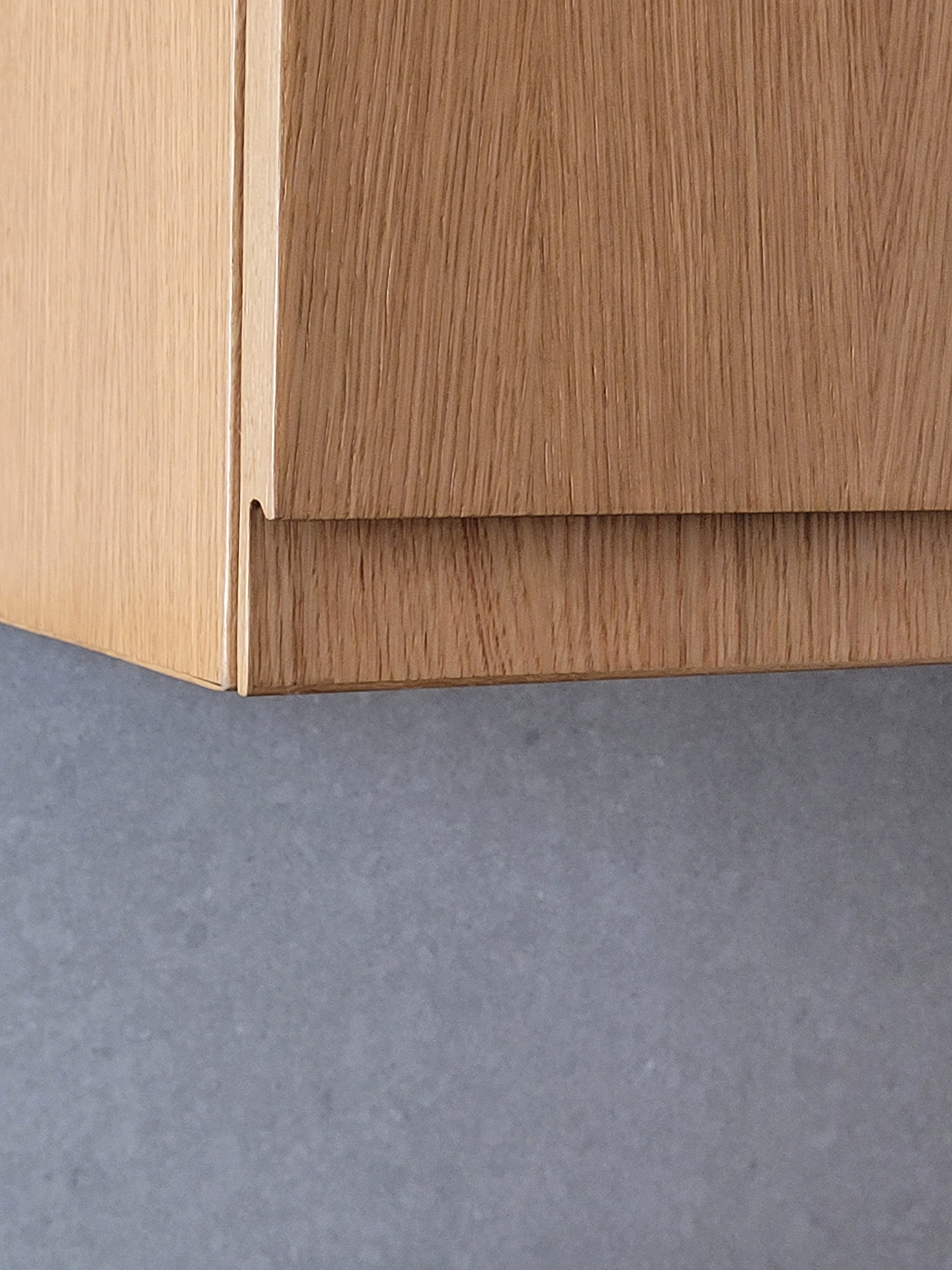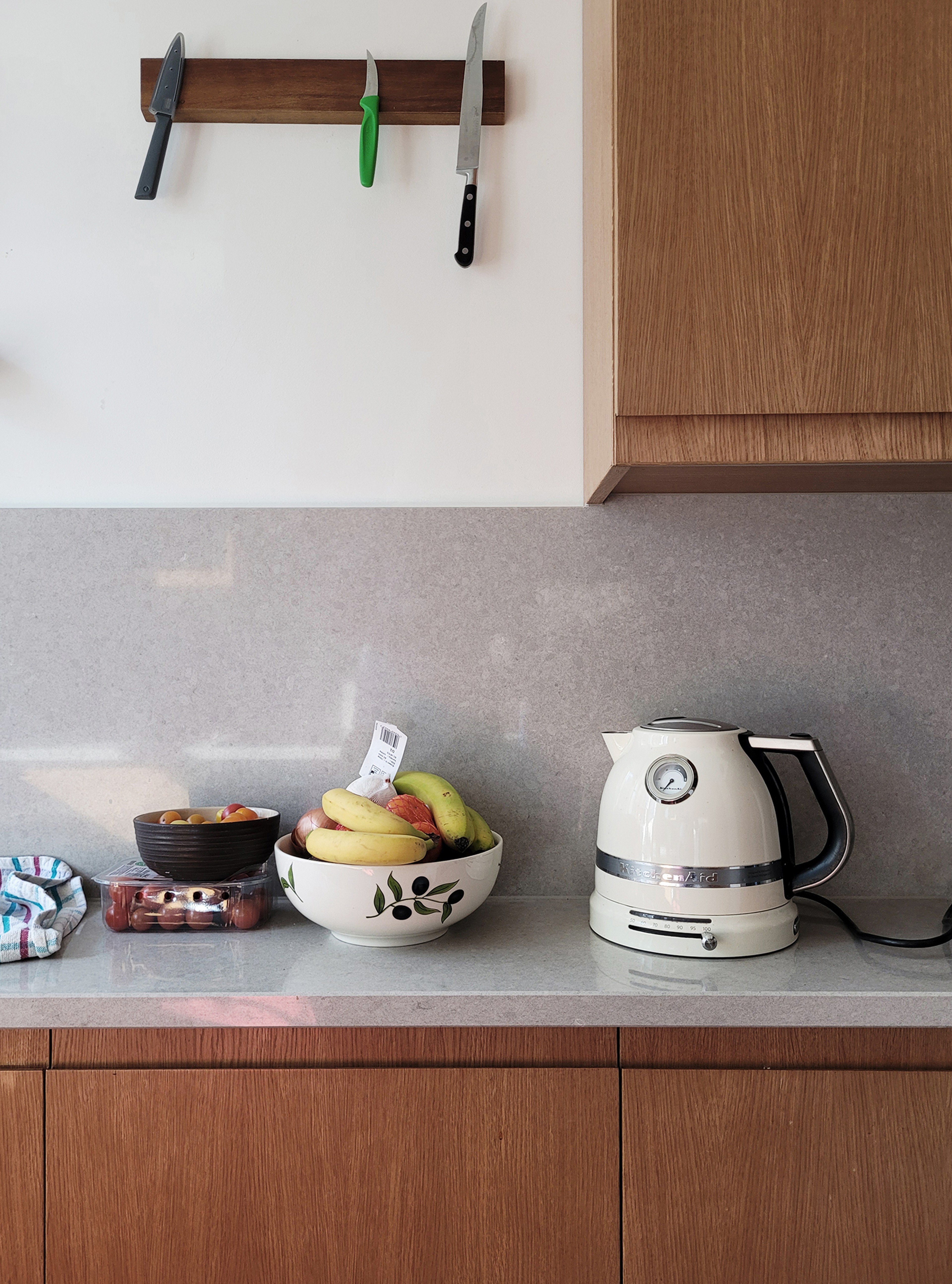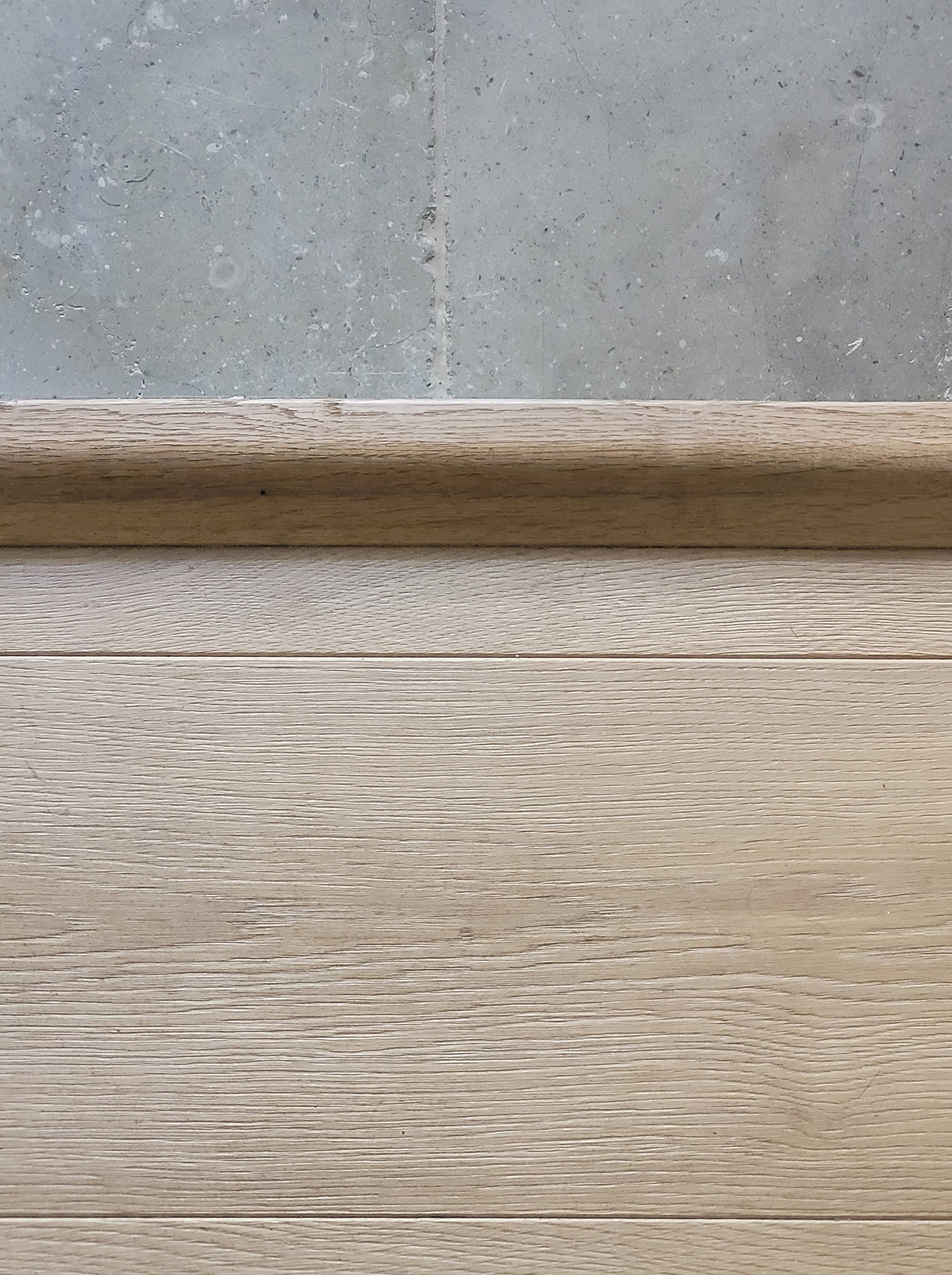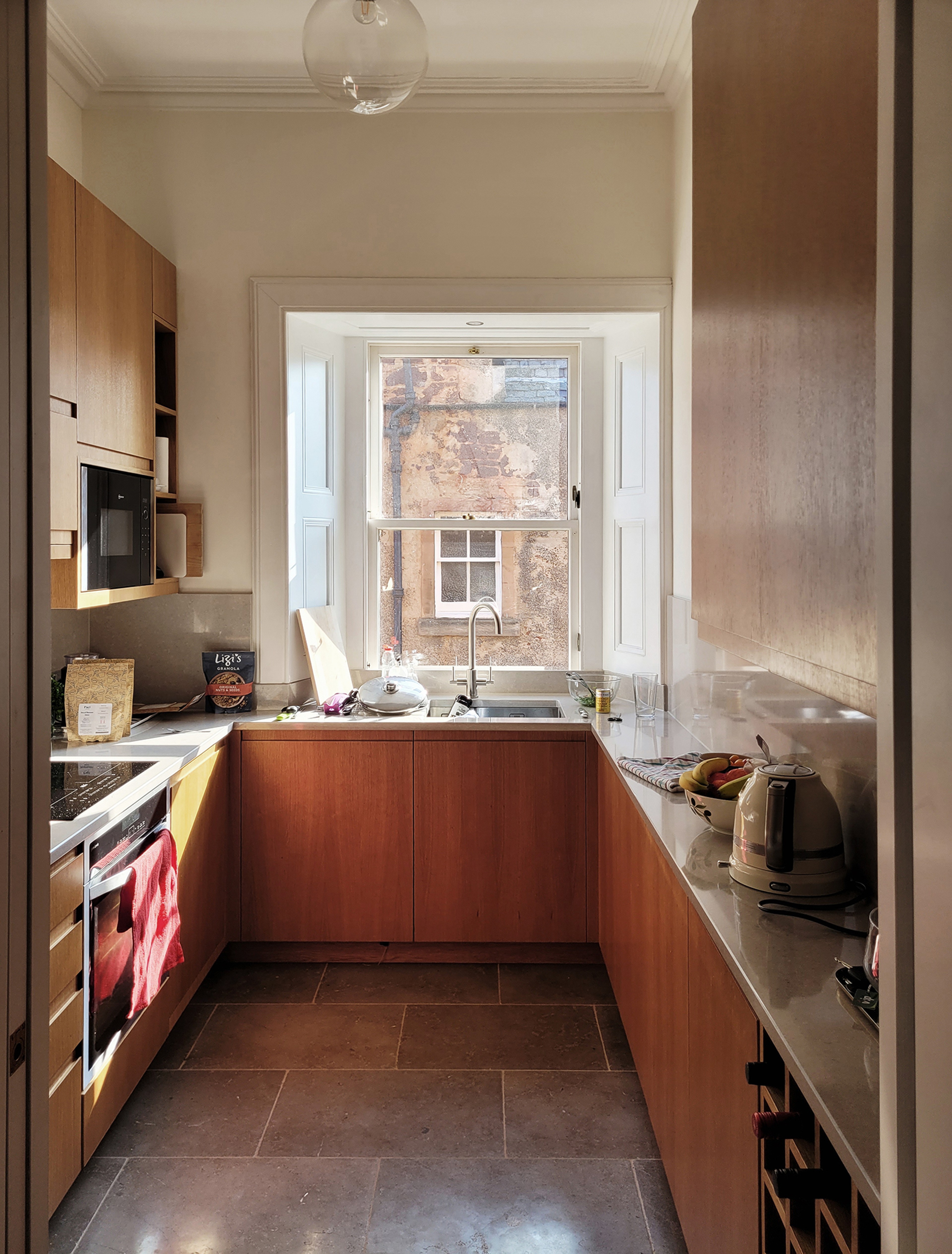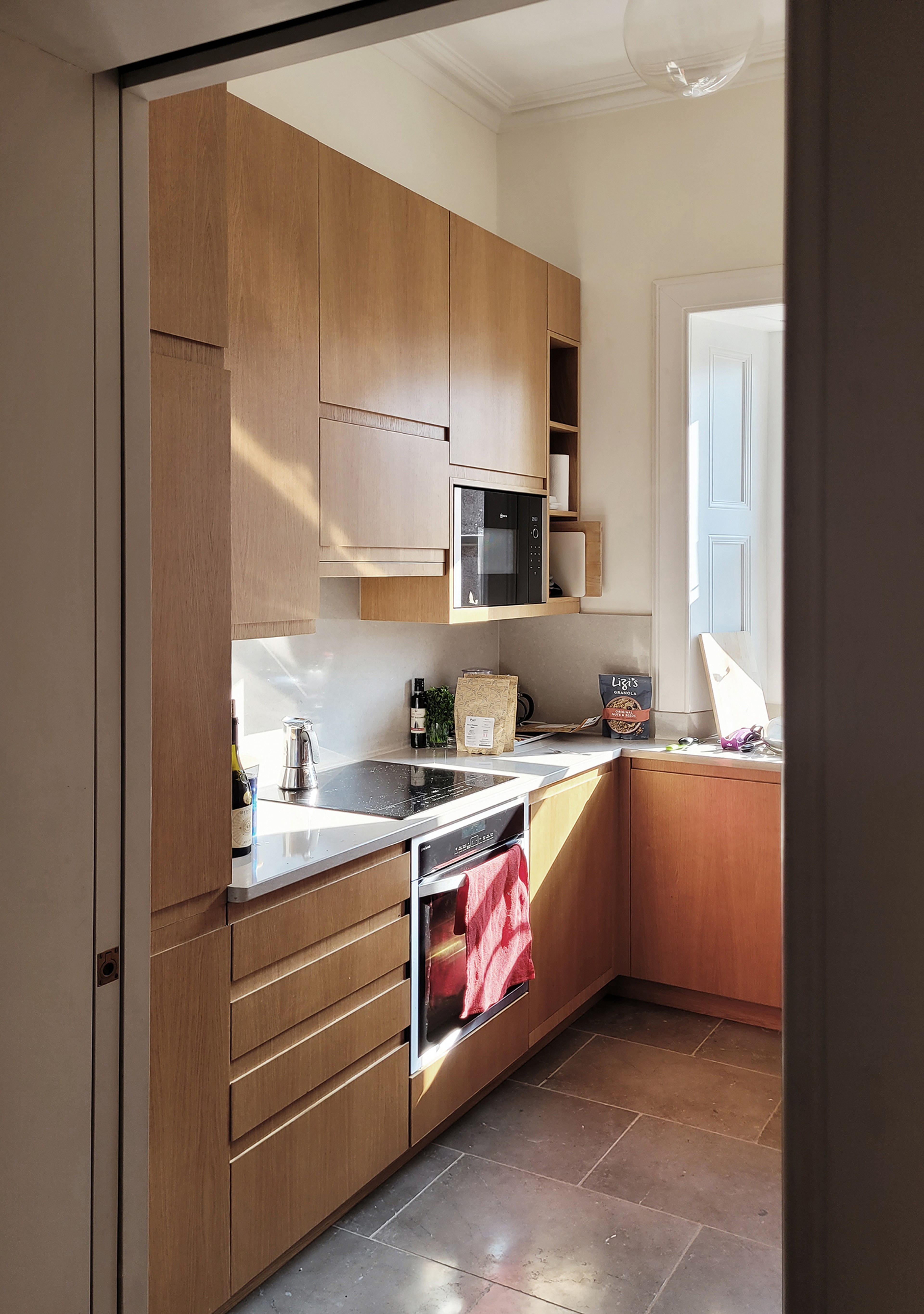 Tired fixtures, finishes and linings are being replaced, one step at a time, to bring the flat up to date. Particular attention is being paid to the simple expression of materials: a new oak floor throughout the living spaces, with wide boards and slightly pronounced grain; warm, oak-faced kitchen cabinetry; a limestone kitchen floor flecked though with fossils.