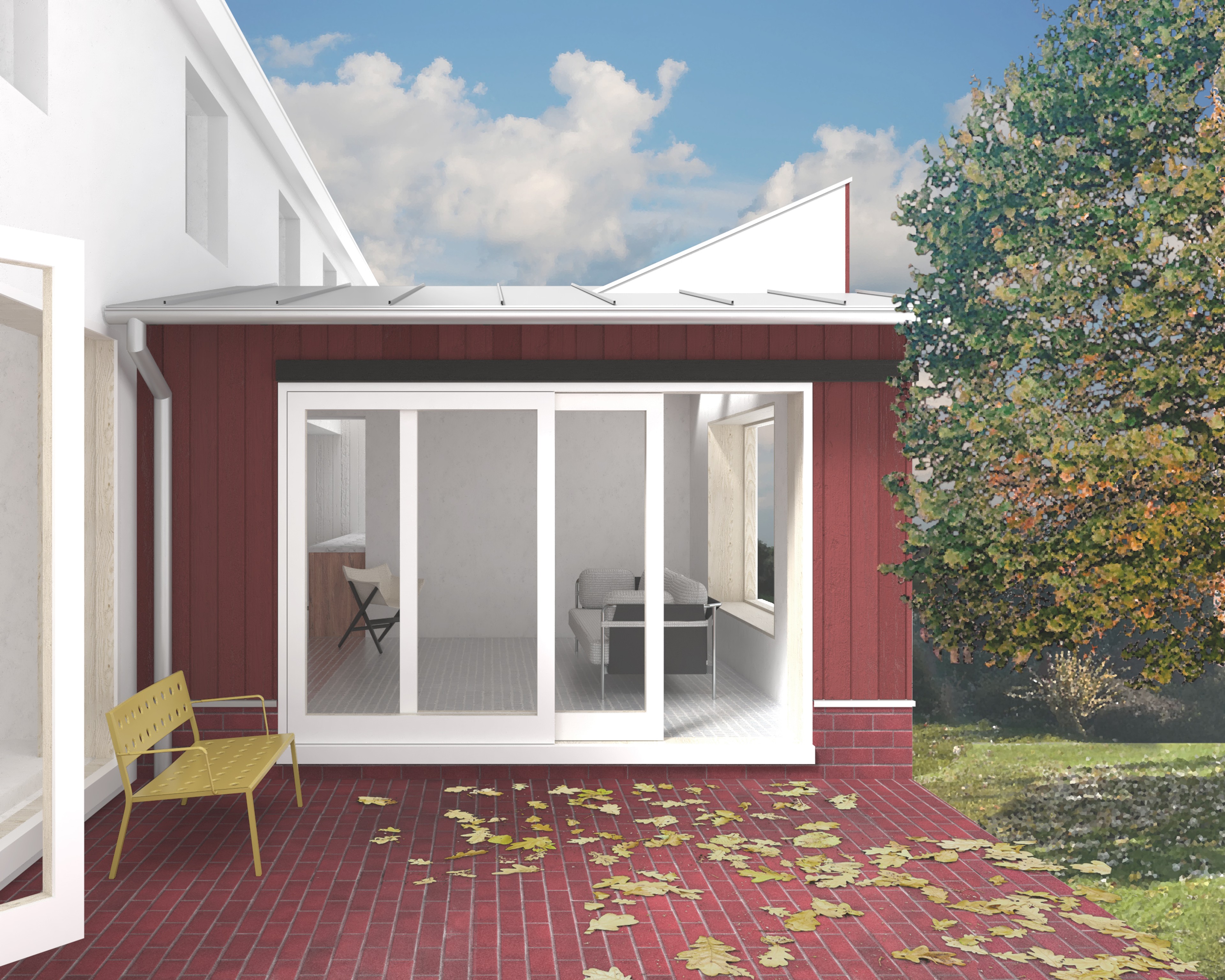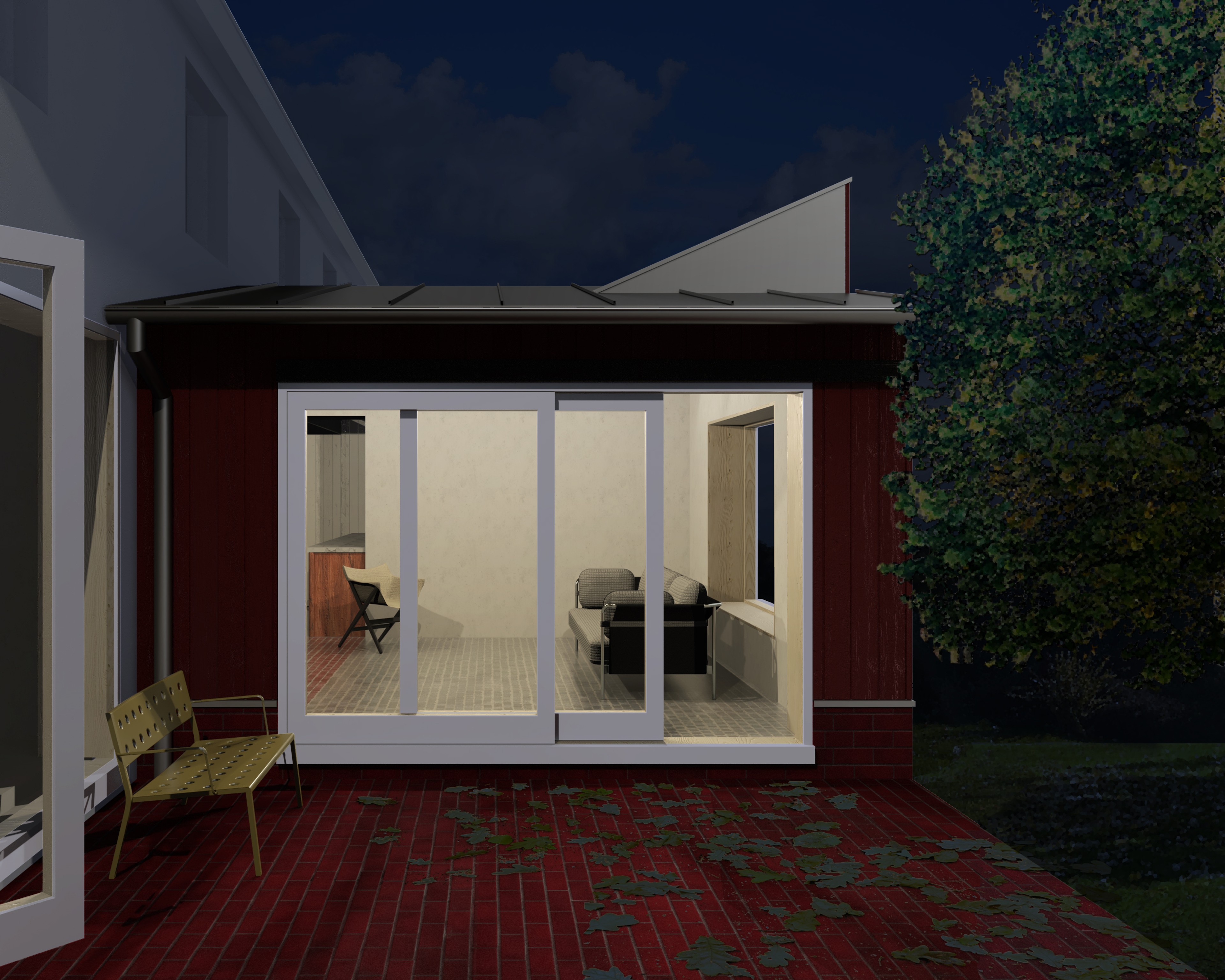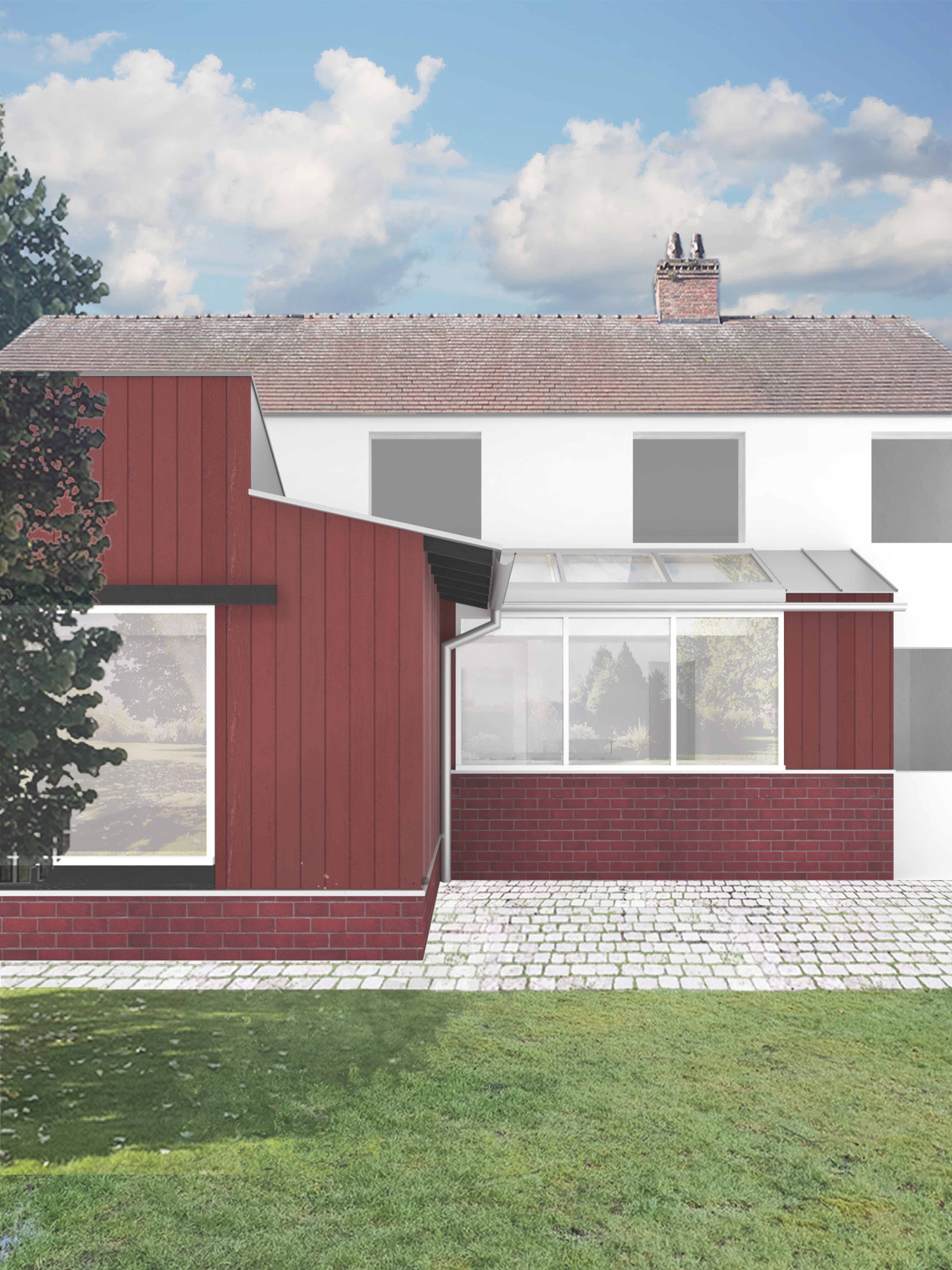 Correspondingly, the extension makes a new figure to the garden. A red-stained timber wall folds around an L-shaped extension. It's outermost surface treated as a single plane, with its thinness accentuated by its detailing against the brick plinth and metal roof. The extension frames a small south-facing seating area adjoined by large sliding doors, beneath a deep overhanging roof. New plastered walls, poured floor, fitted joinery, and timber boarded ceilings complete the interior palette.