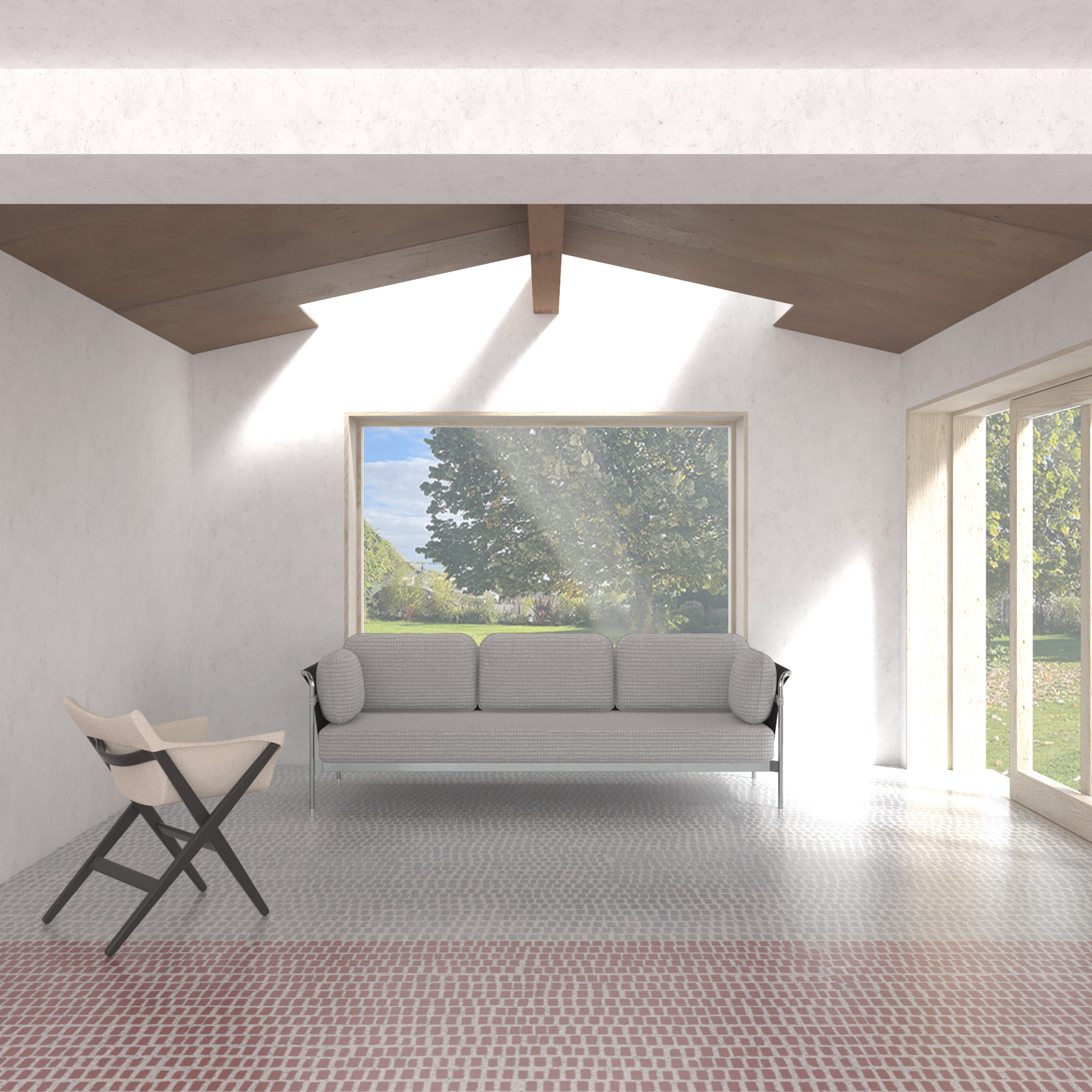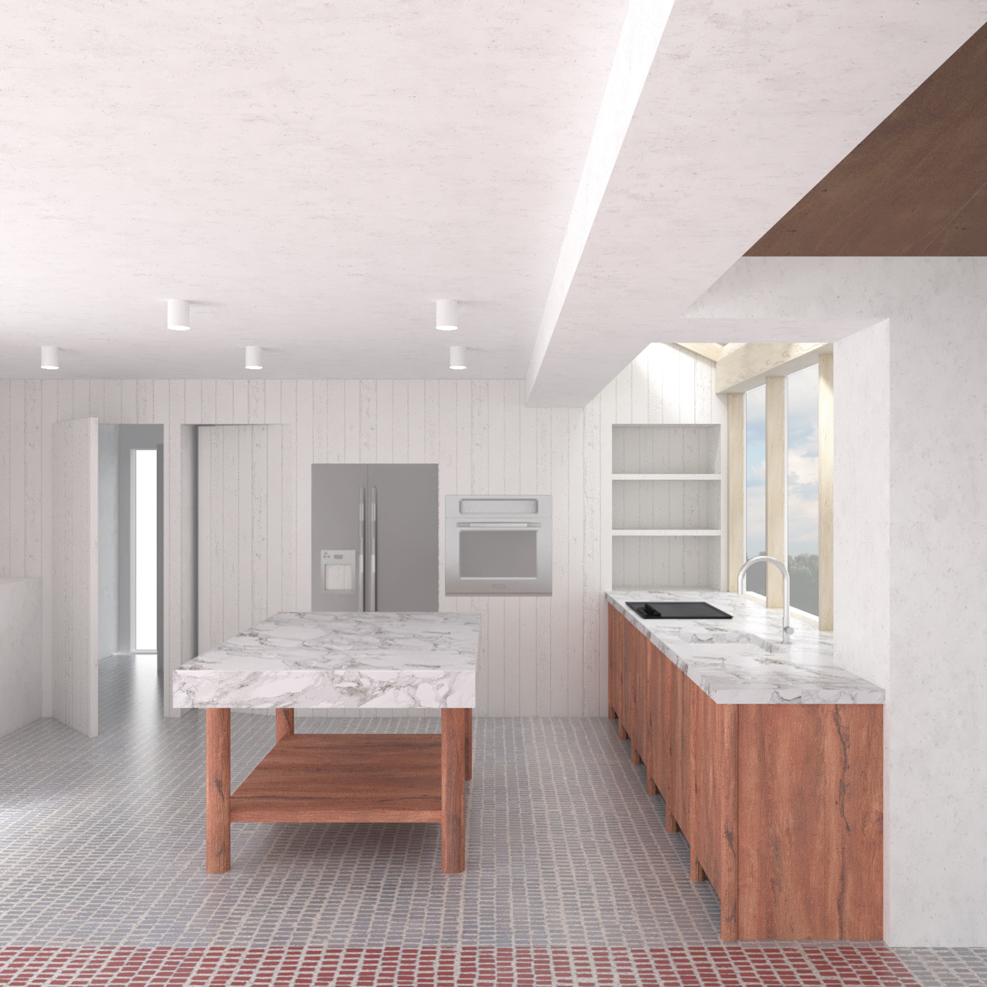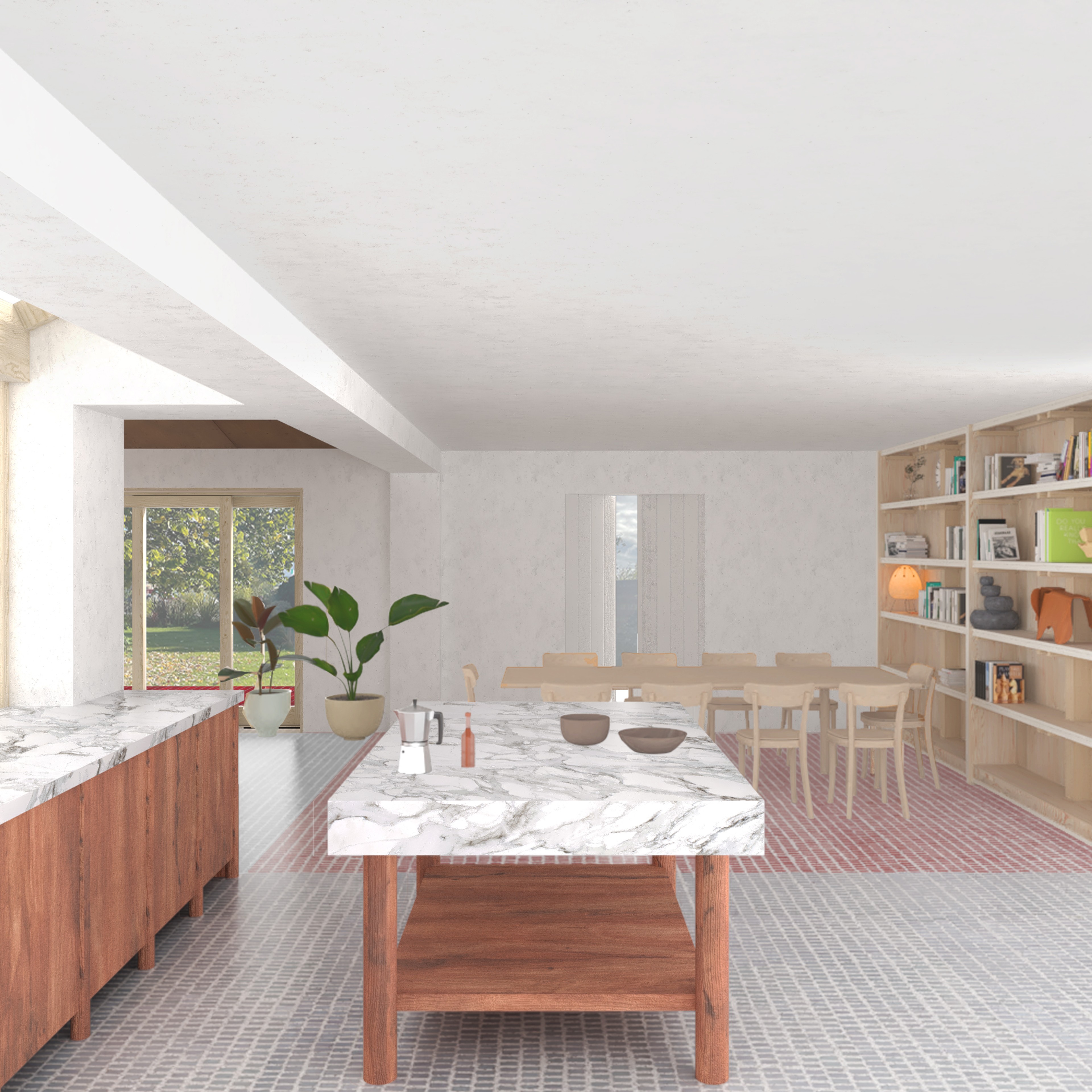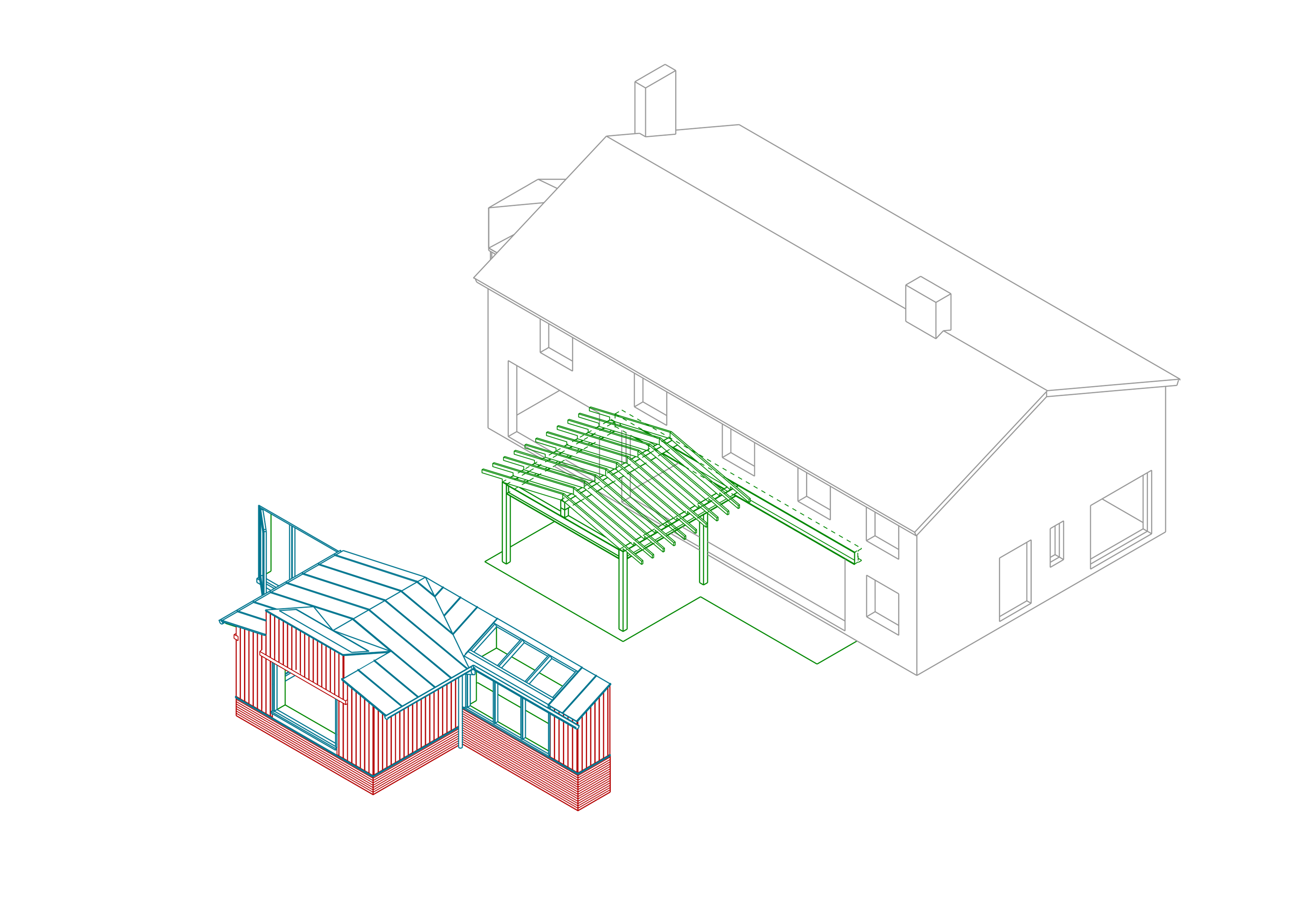 Correspondingly, the extension makes a new figure to the garden. A red-stained timber wall folds around an L-shaped extension. It's outermost surface treated as a single plane, with its thinness accentuated by its detailing against the brick plinth and metal roof. The extension frames a small south-facing seating area adjoined by large sliding doors, beneath a deep overhanging roof. New plastered walls, poured floor, fitted joinery, and timber boarded ceilings complete the interior palette.