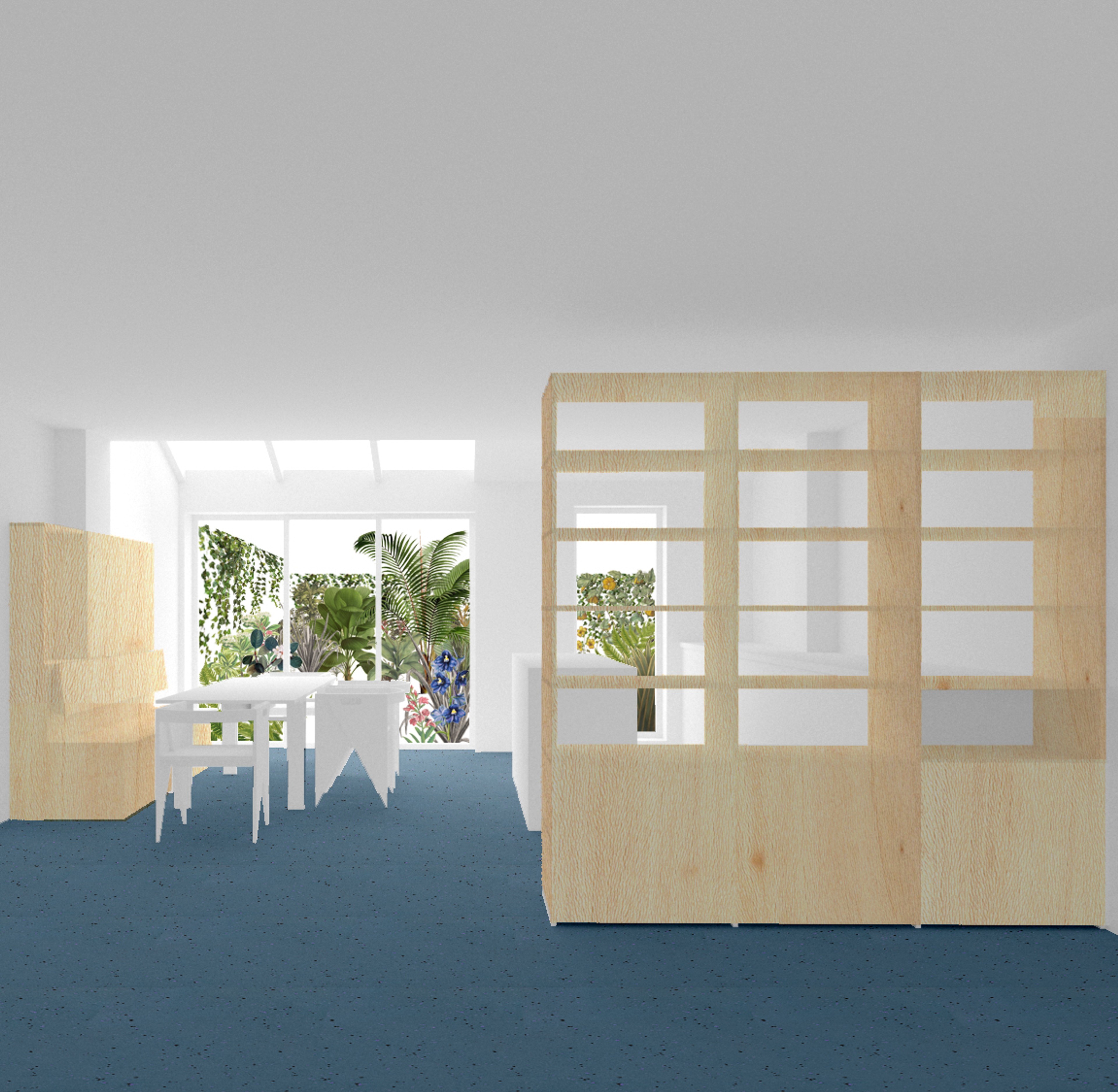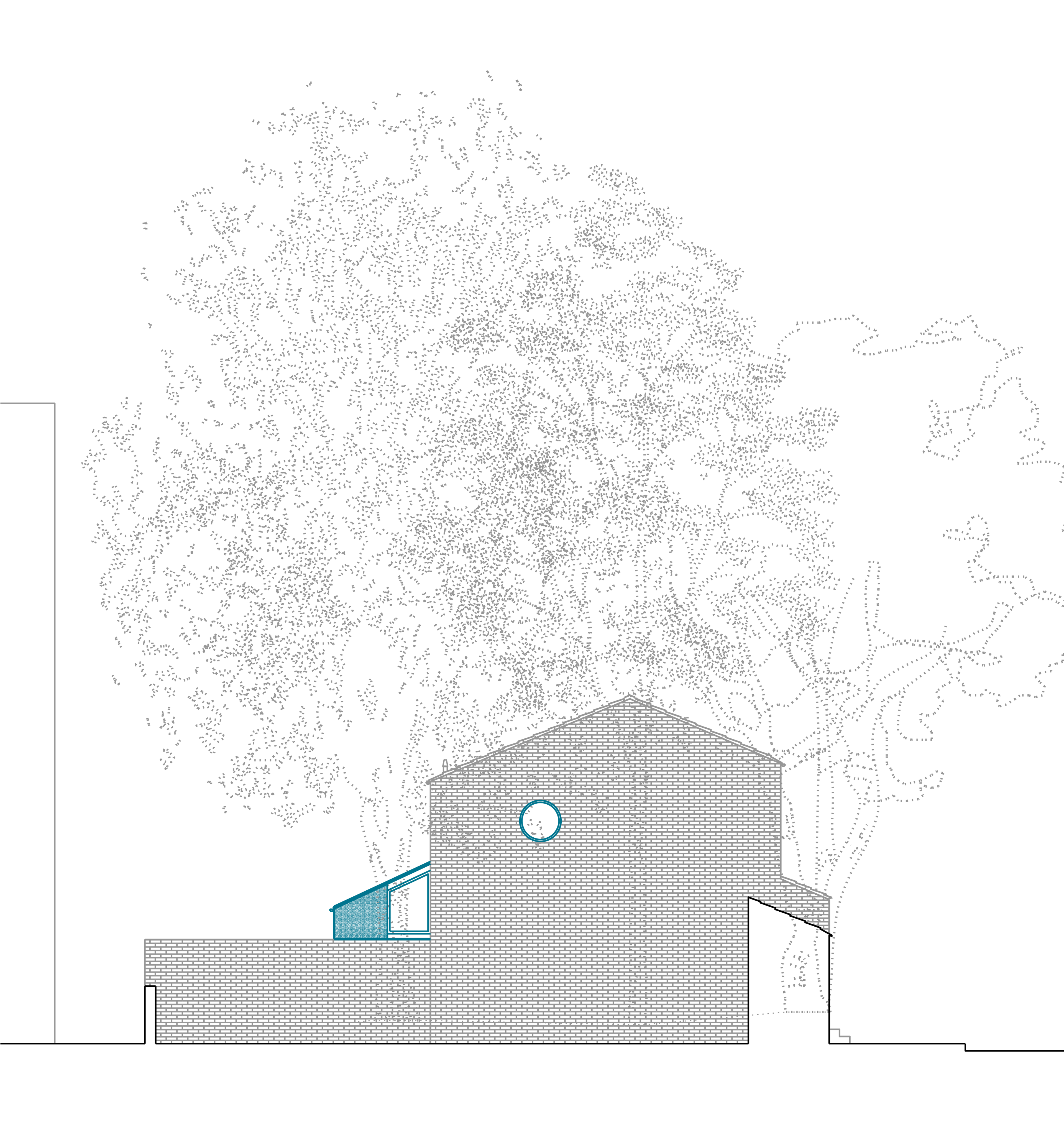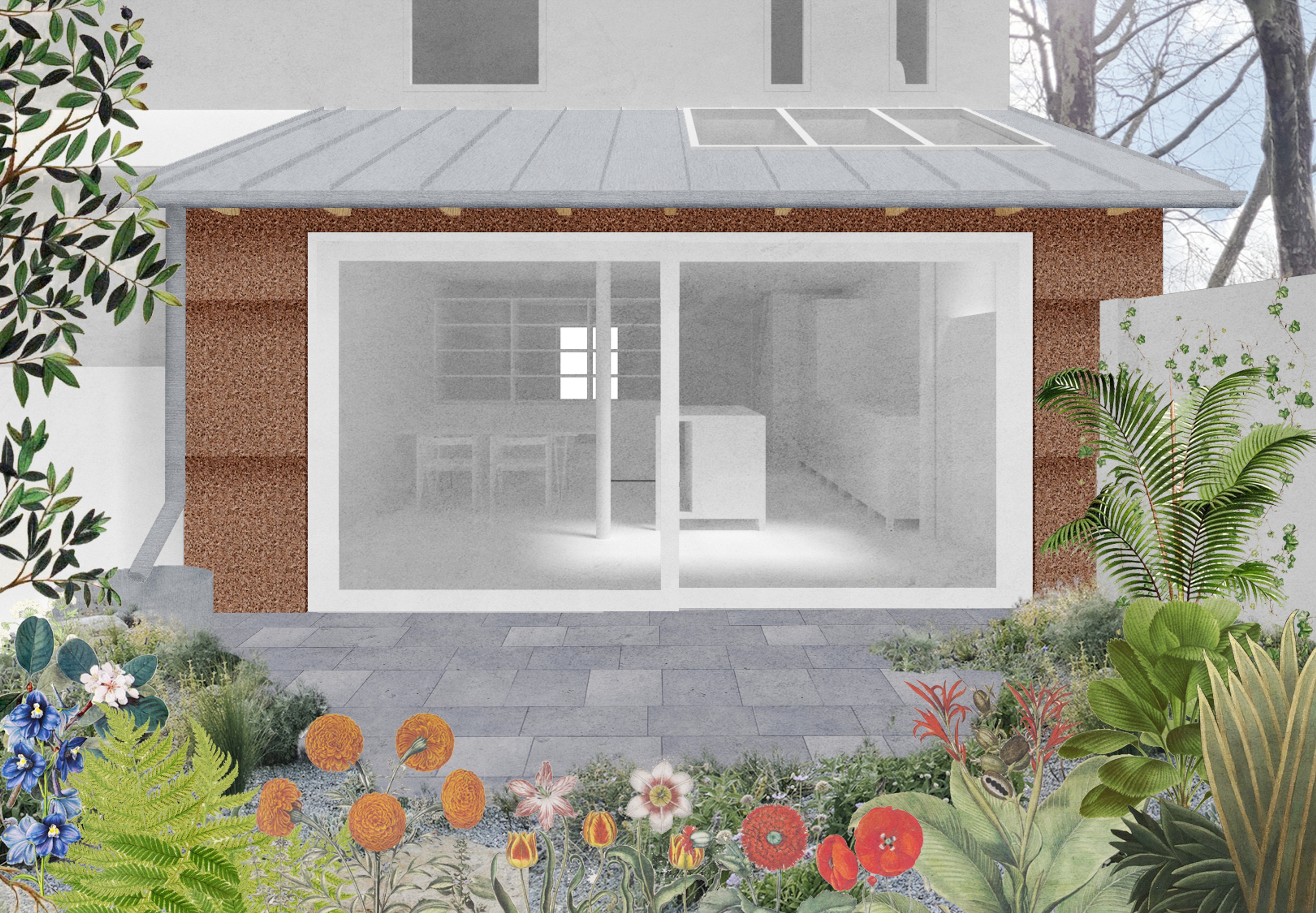 The proposal includes a single-storey rear extension that follows the profile of the existing kitchen lean-to. Existing windows are to be replaced throughout with new energy-efficient units, while a new circular landing window grants views towards an adjacent church. New sliding doors connect the new open-plan ground floor out to the garden. The extension will be clad in cork panels stained to match the bricks, resulting in a high-quality contemporary contextual design, sympathetic to the setting, character and appearance of the conservation area. In close collaboration with our joiner client, new flexible furniture elements will be designed to loosely sub-divide the space.