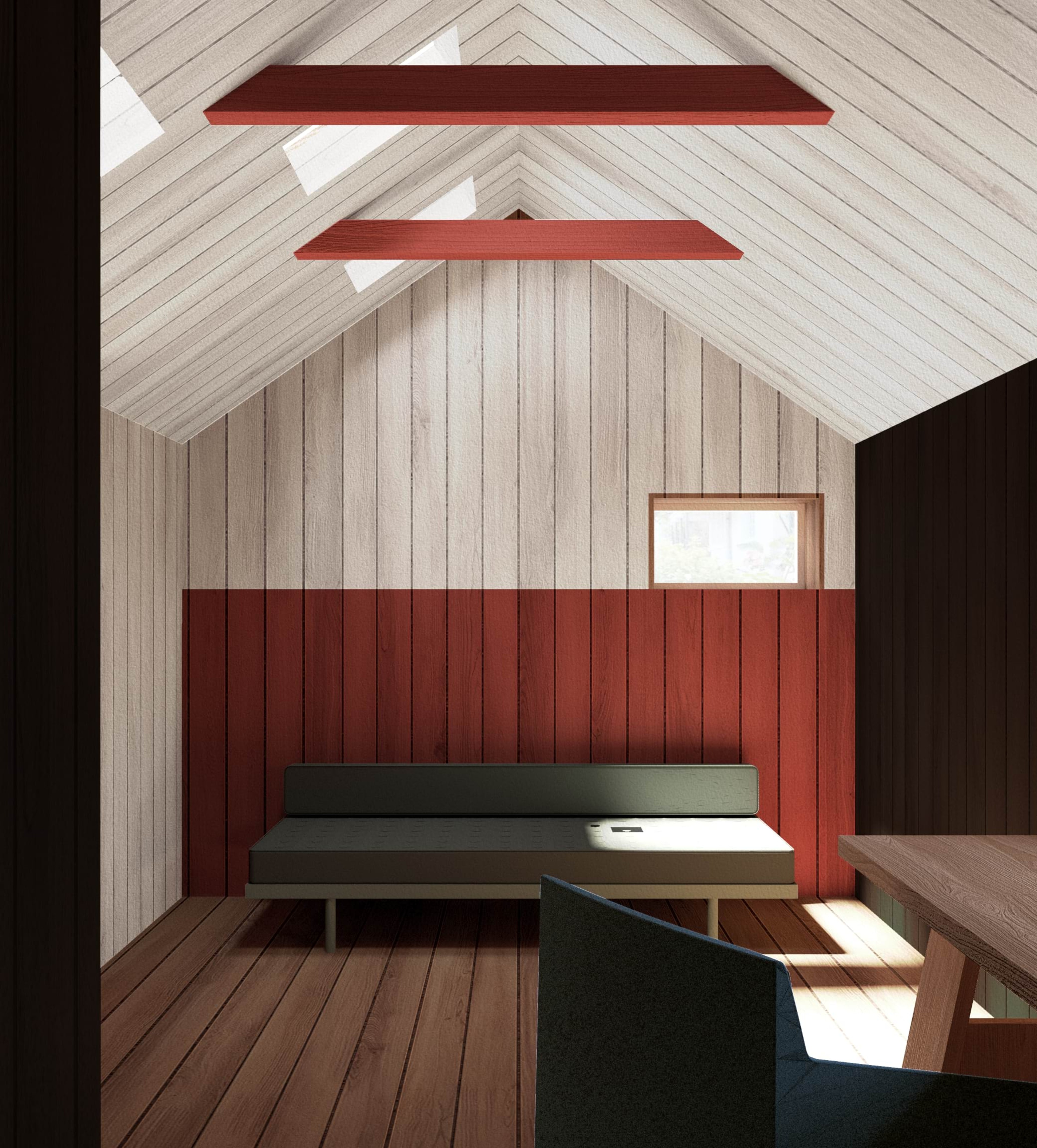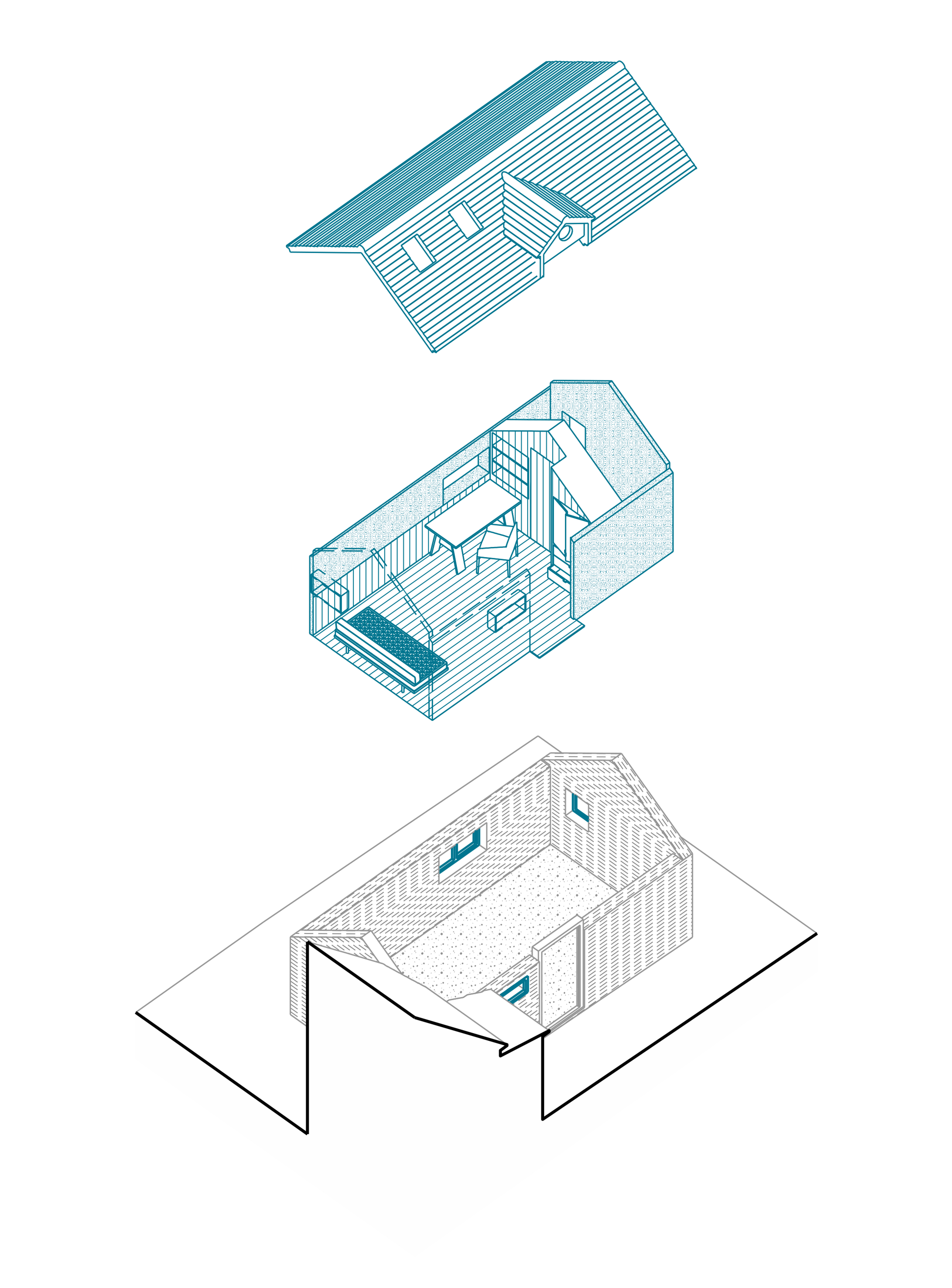 Then, working largely from the inside on a constrained site, the proposals are designed to be completed over a longer period of time, to suit the client’s needs. The material palette includes only dry trades and natural materials which can be dismounted, cut and re-hung as necessary. The resulting project is very compact – just one room plus a bathroom – so efficient and inventive joinery elements allow the space to shift in accordance with its desired use(s) and the seasons.