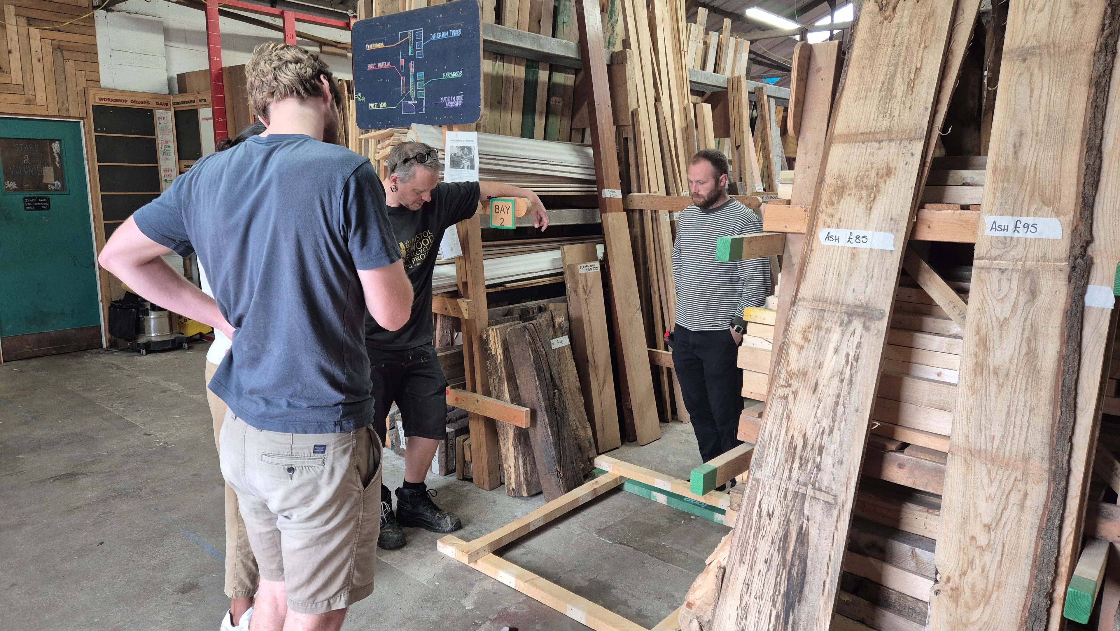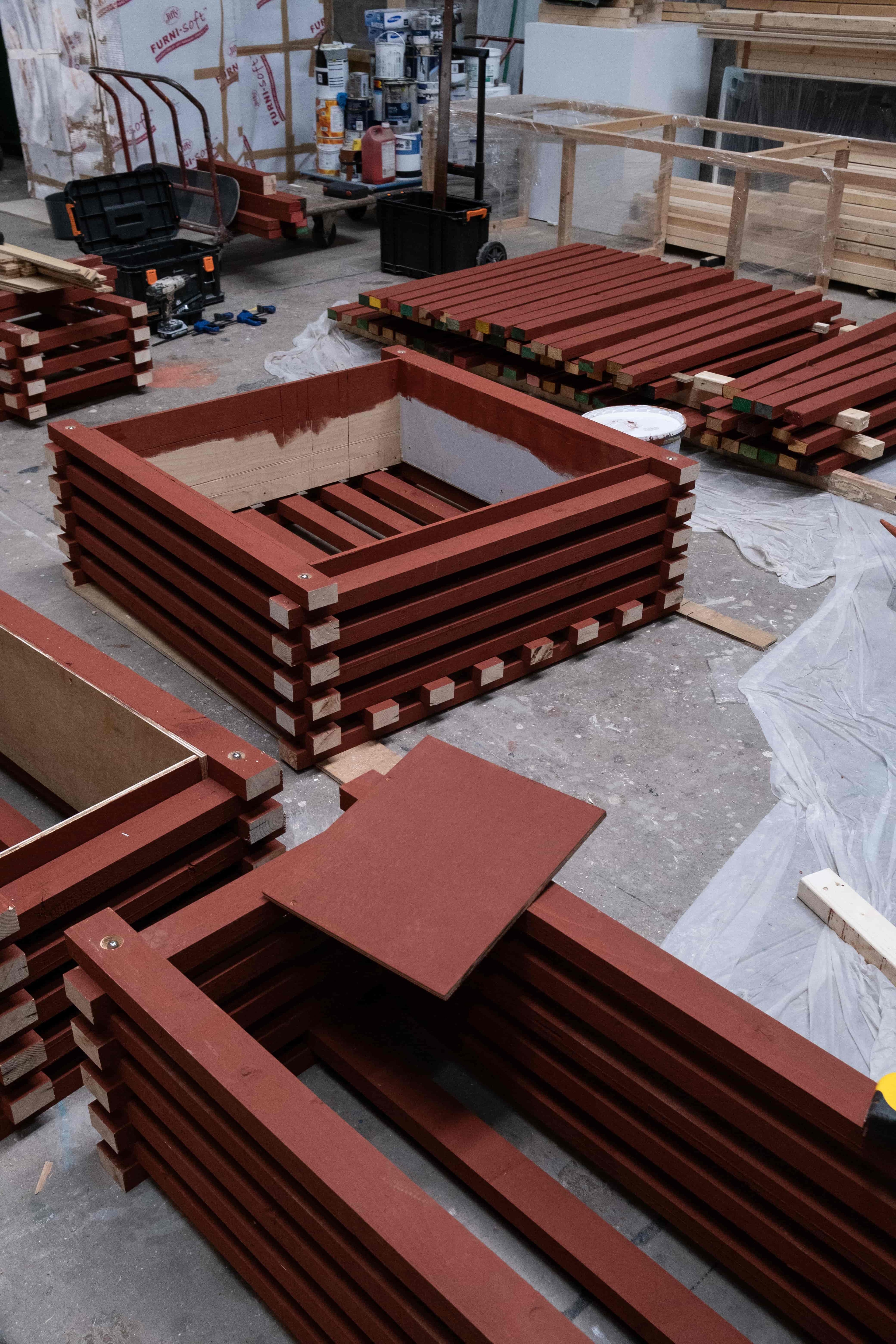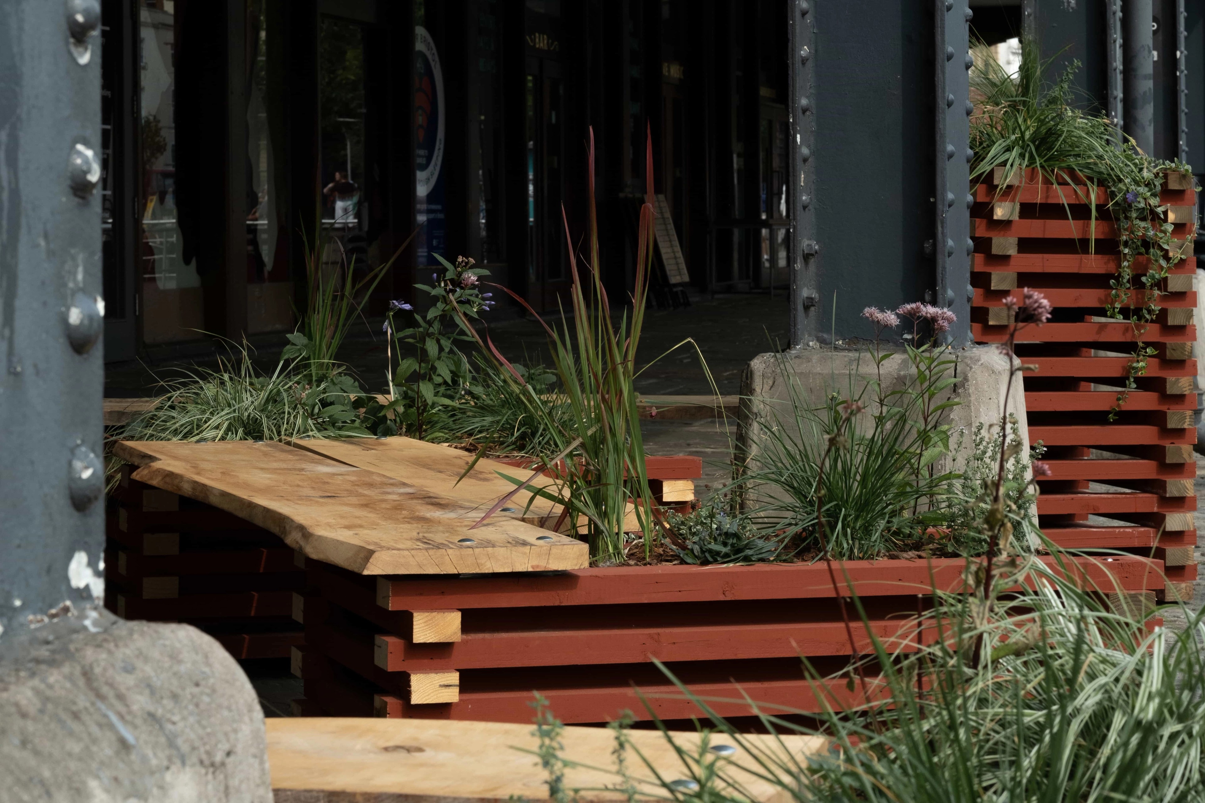 The primary construction materials were procured from Bristol Wood Recycling Project, a not-for-profit Social Enterprise that redirects waste wood from landfill and provides affordable, salvaged timber to Bristol communities. Reclaimed pallet wood, regularised in BWRP’s workshop, was the primary construction module used to form the planters. These precise, machined components sit in contrast to the waney edge sycamore planks which form the seats. An environmentally friendly oxide red paint coats the pallet wood, with the clean sawn ends left exposed. The natural warmth and grain of the sycamore is left on show.