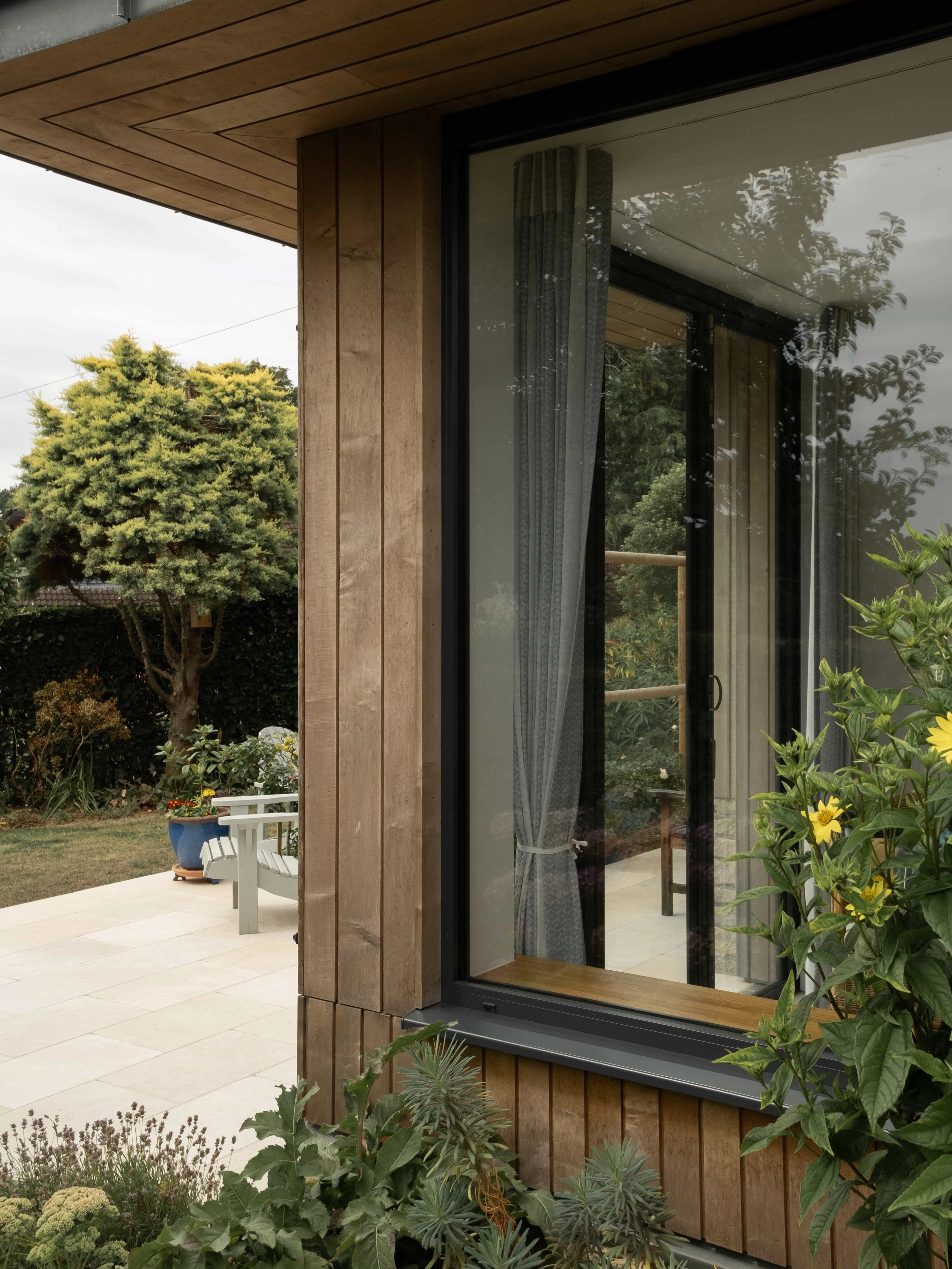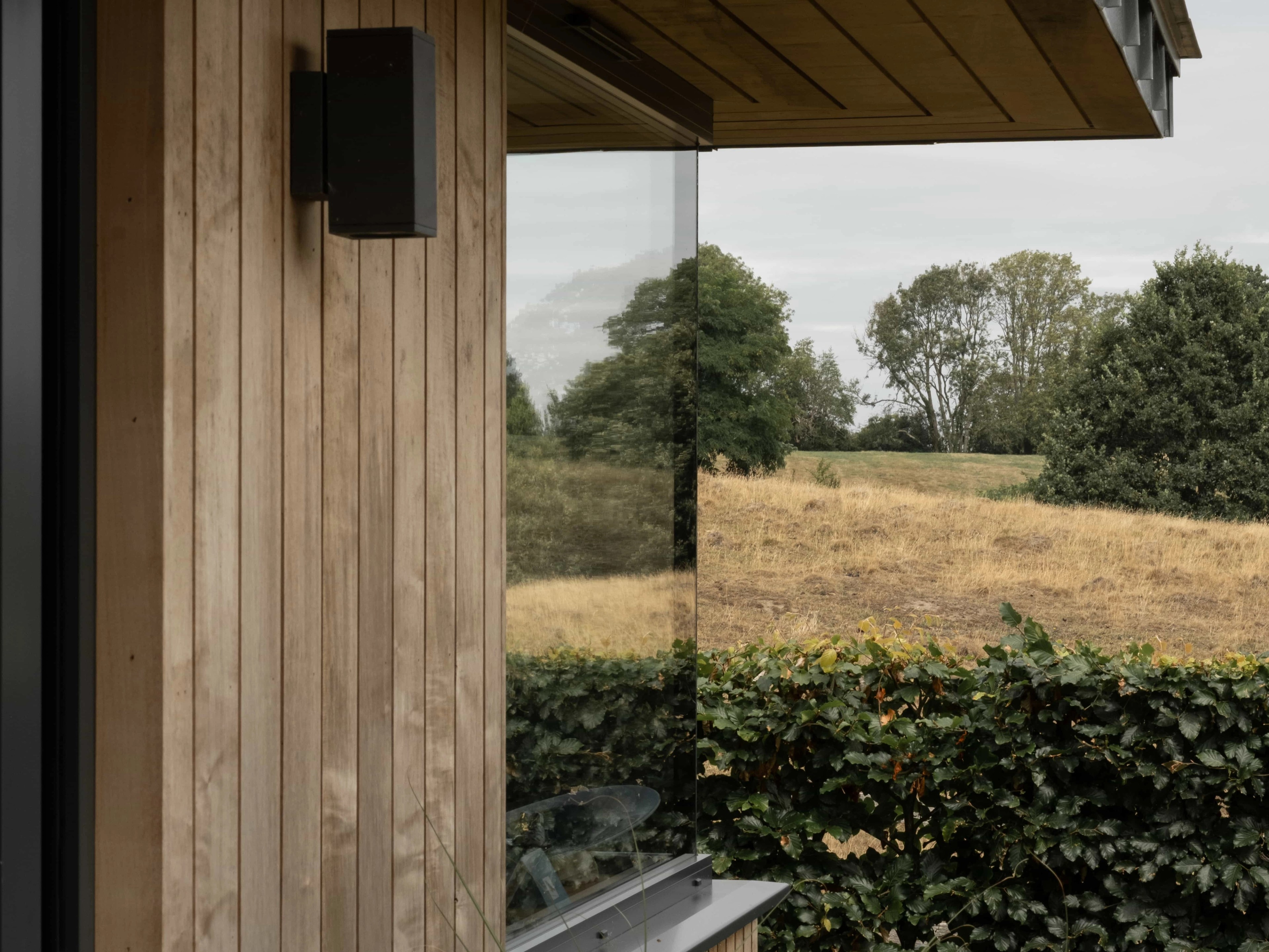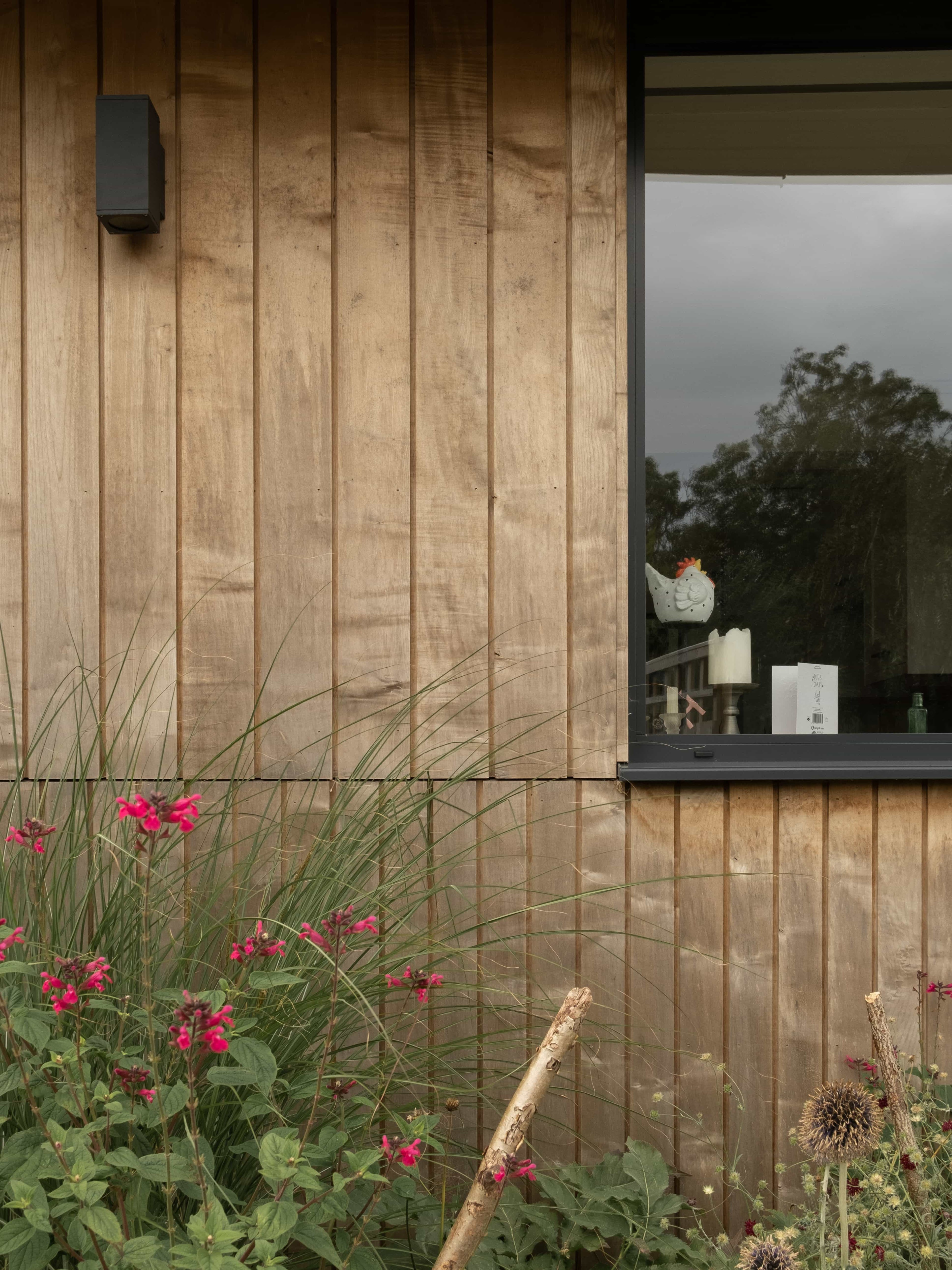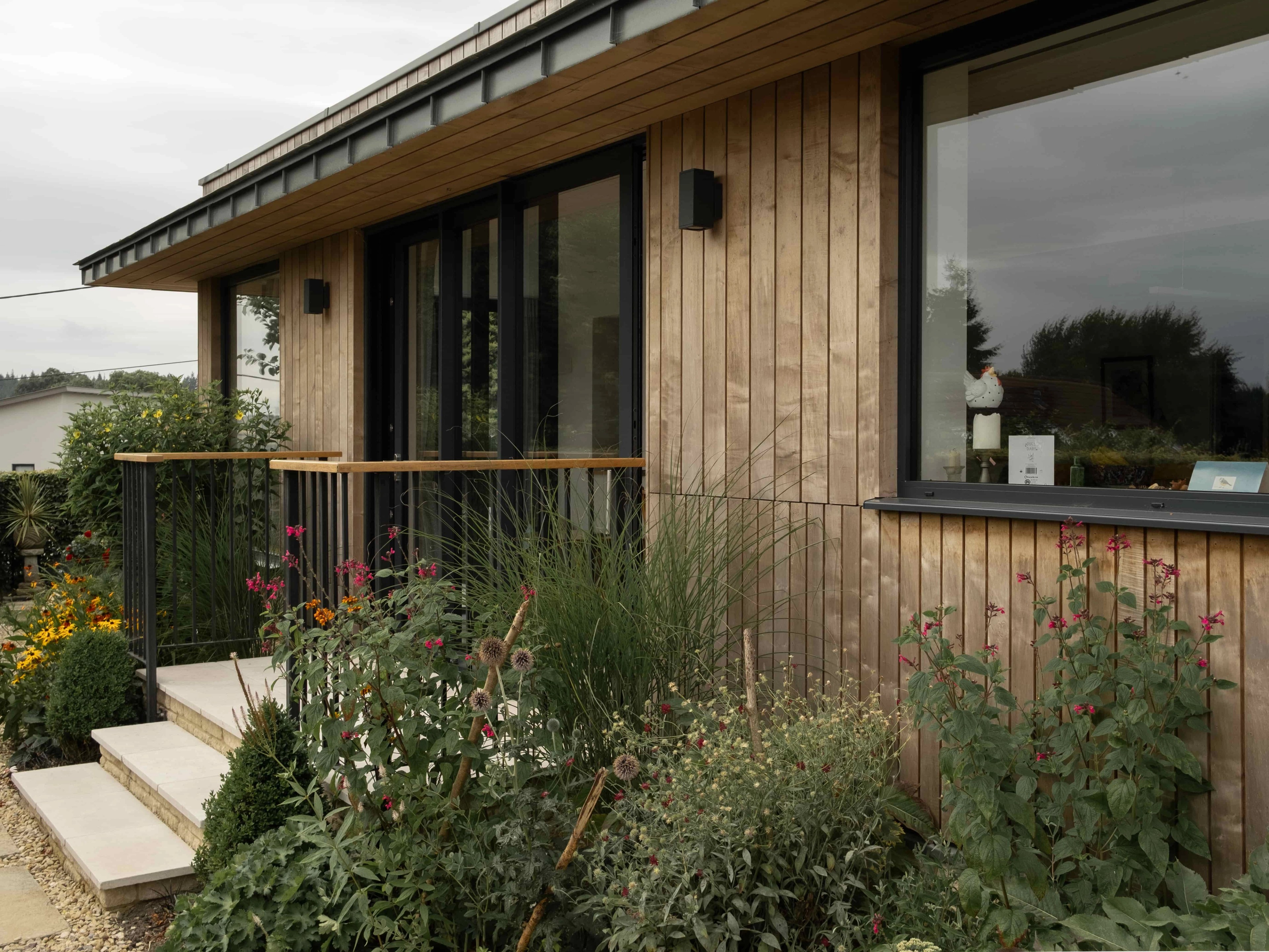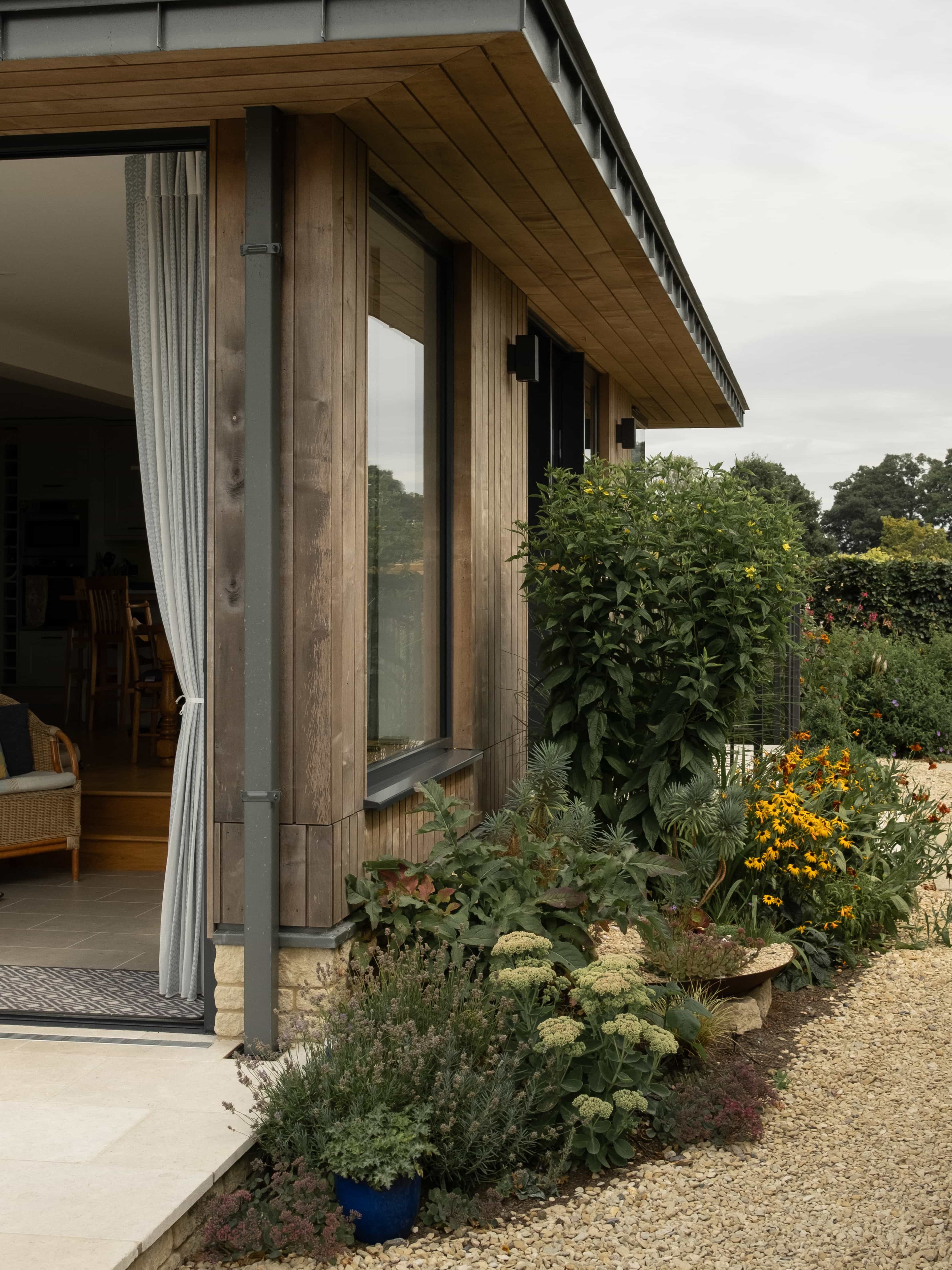 A deep canopy adds definition to the roof line and provides additional shading from high summer sun. Locally sourced Poplar, set out in varying board widths, completes the external material palette.