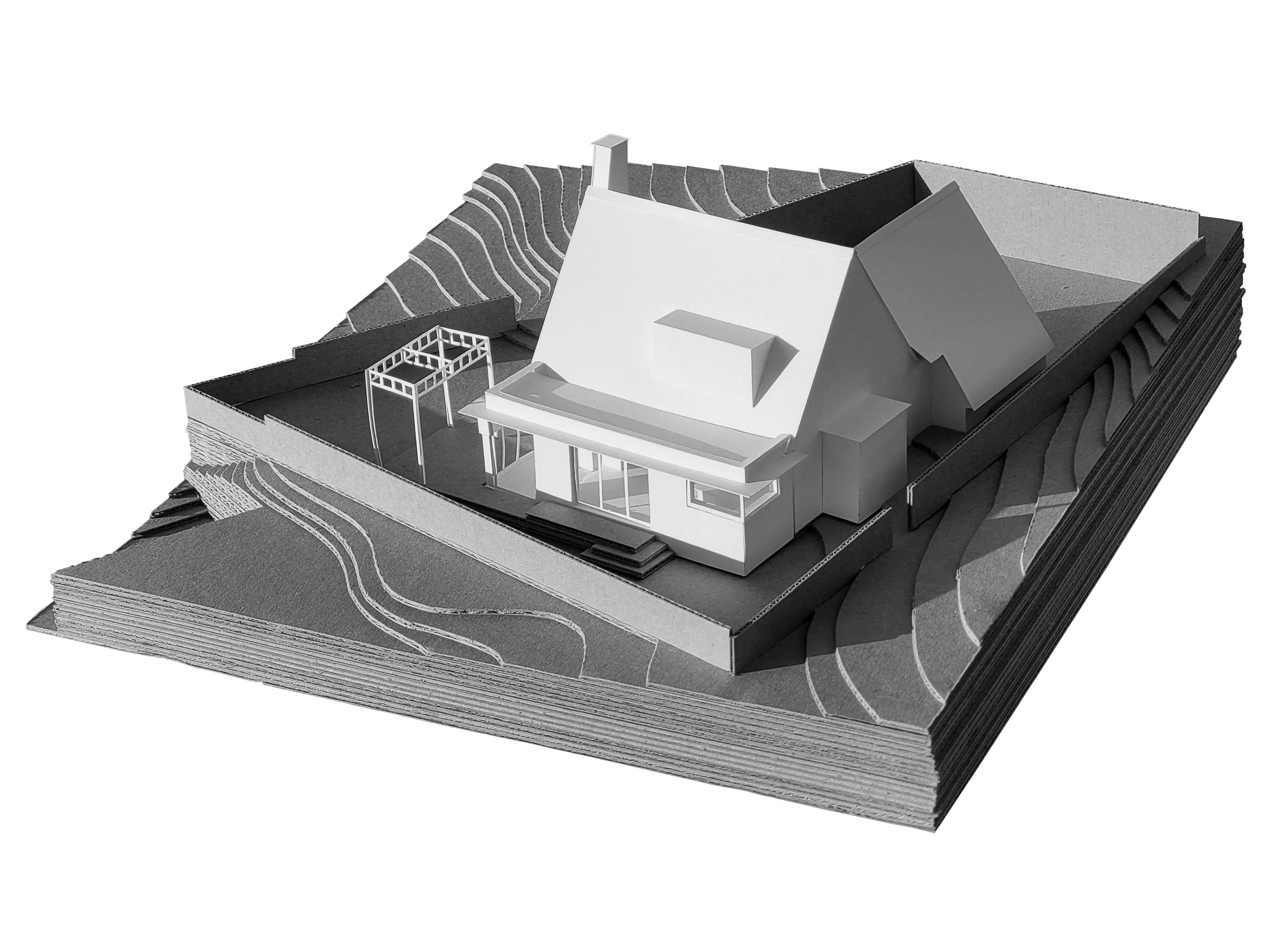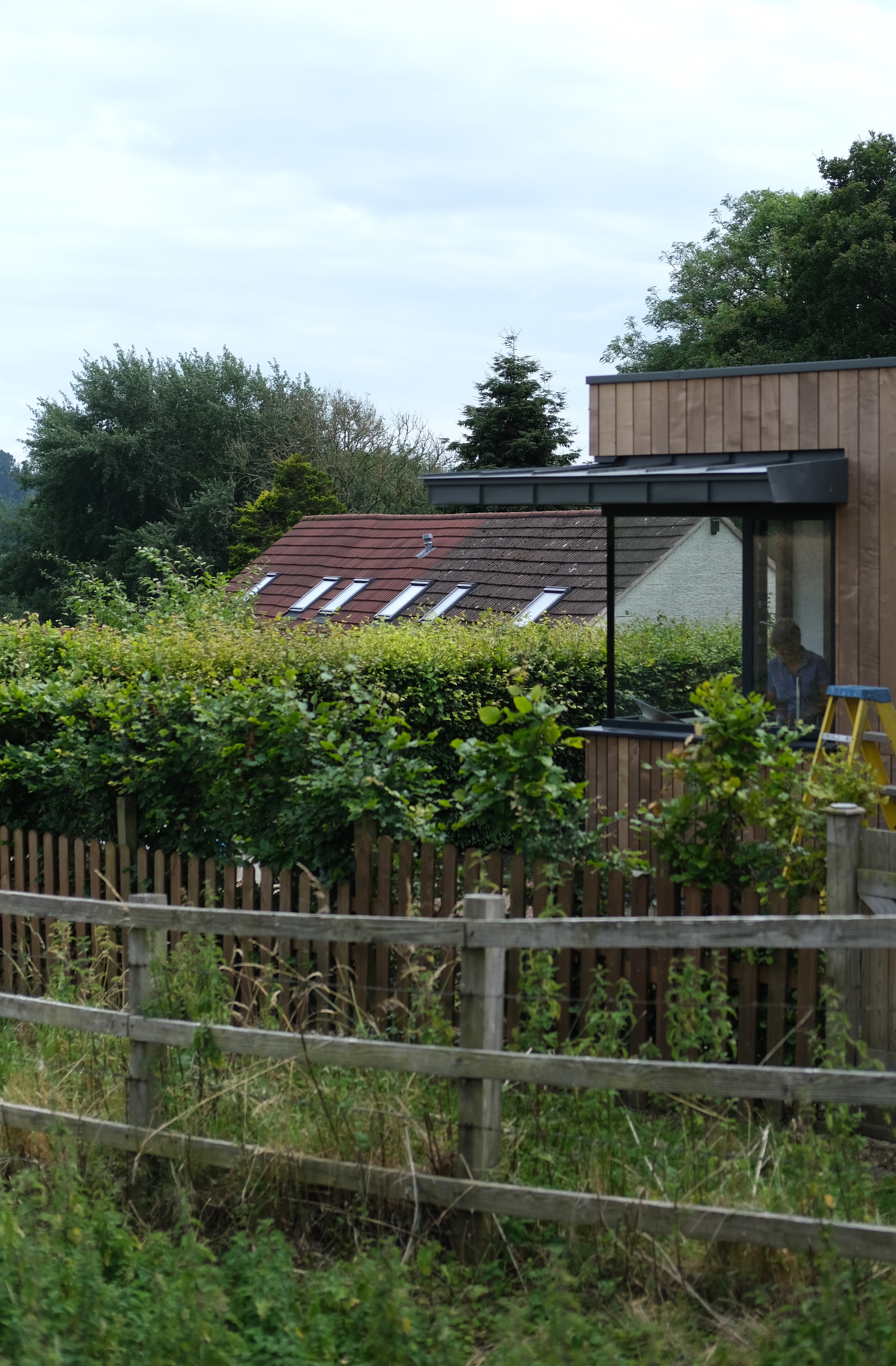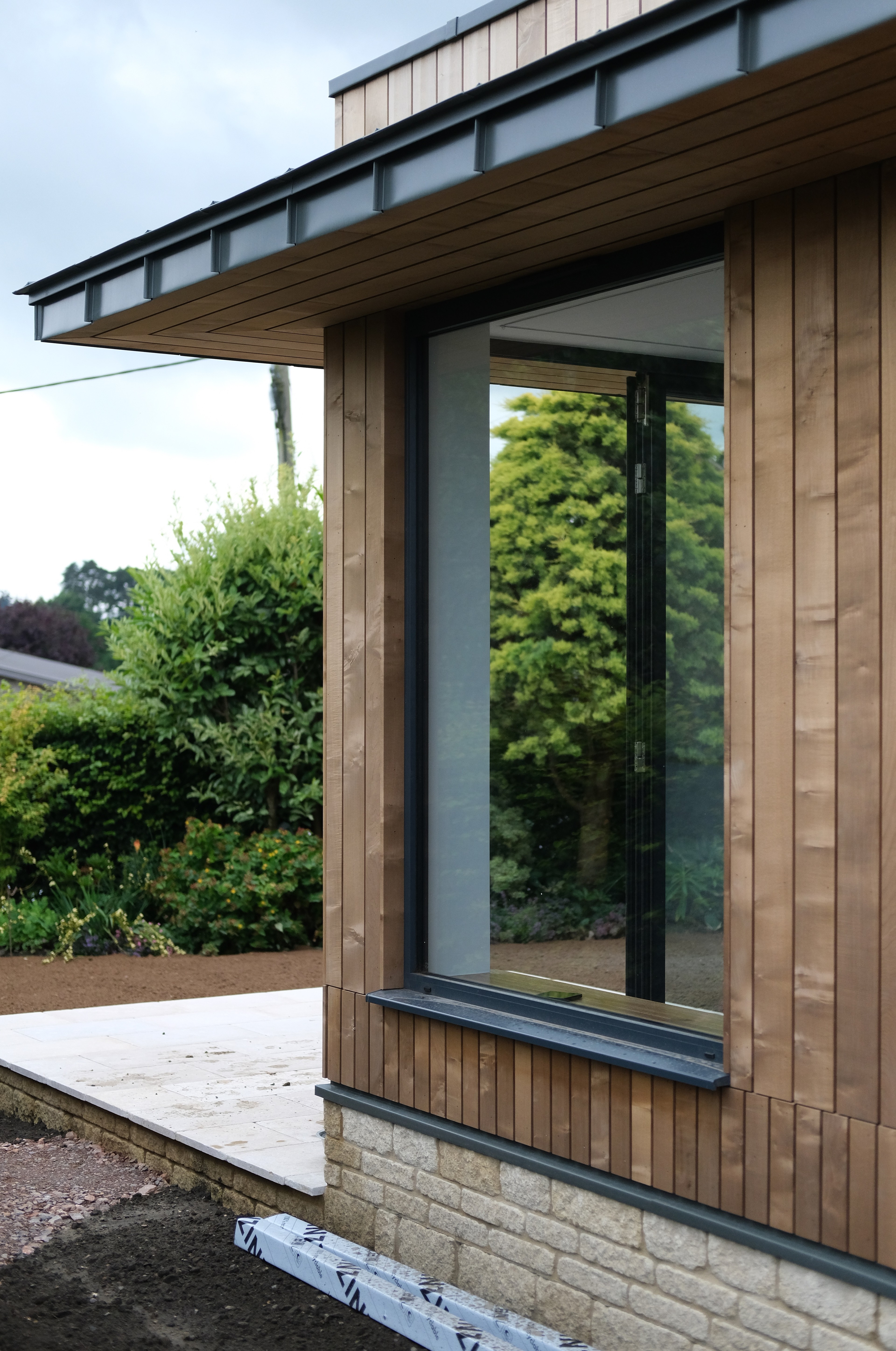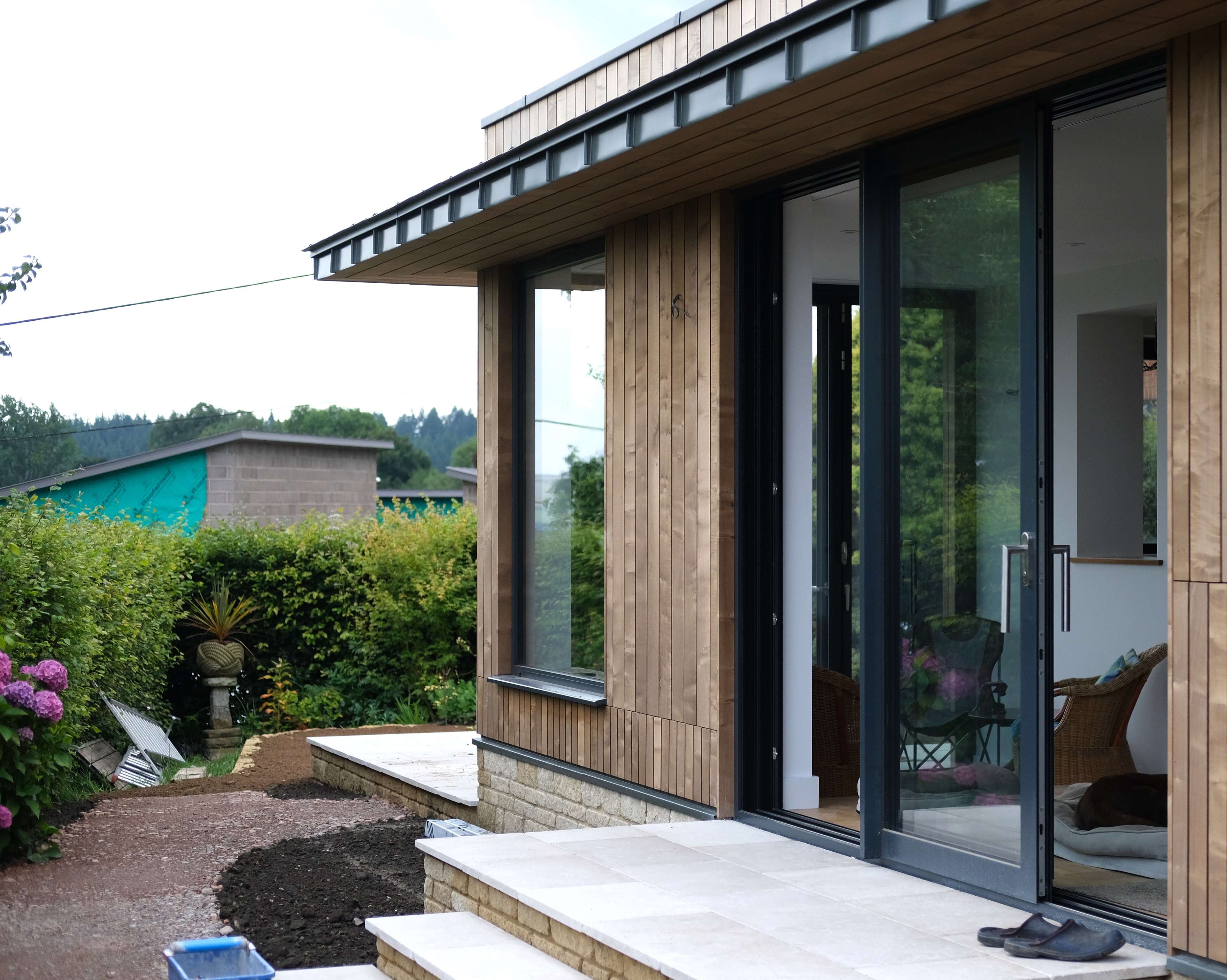 Two existing extensions are demolished, and a new single storey, timber clad extension lines the East elevation. Controlled openings in the new external walls provide framed views of the changing scenery to the North, East and South. Two new sets of doors grant access to different areas of garden, including a new raised patio with a fine-framed pergola structure. This will provide solar shading to the glazed South elevation and a shady spot to sit an enjoy the view in the summer.